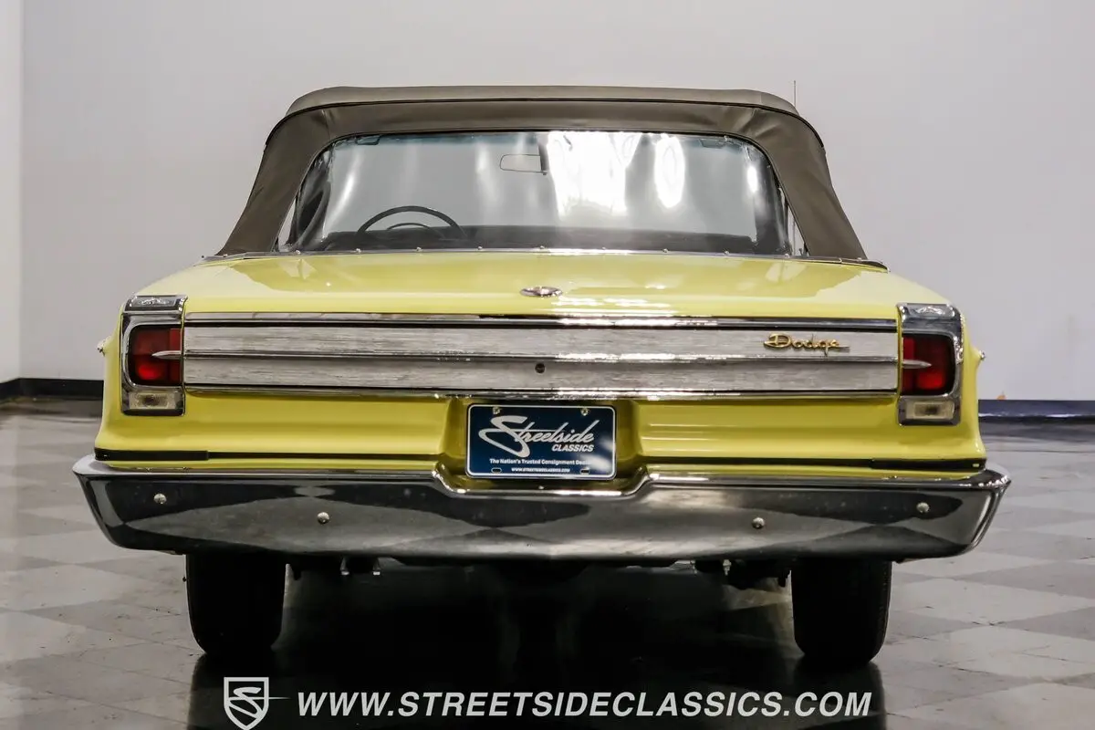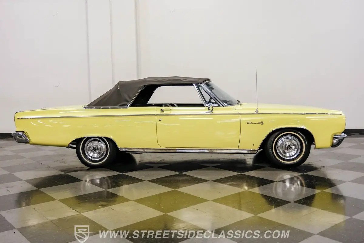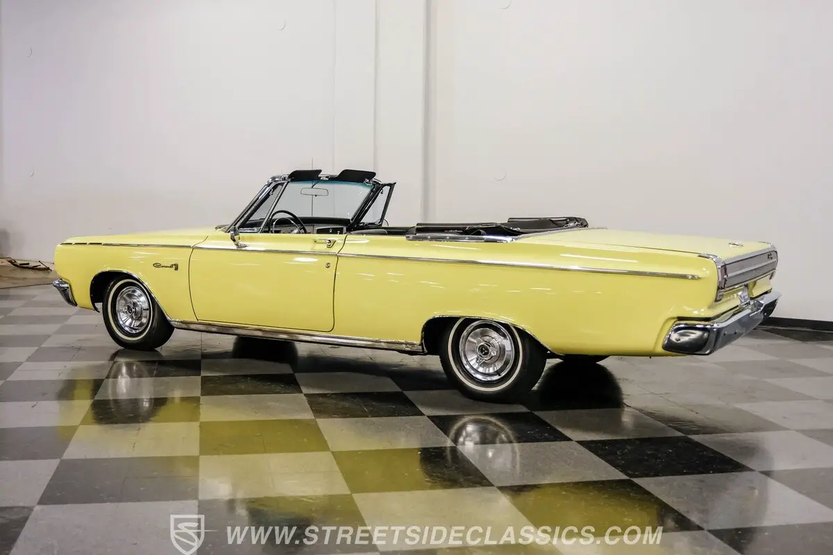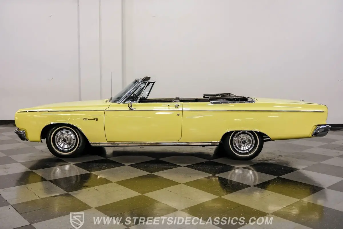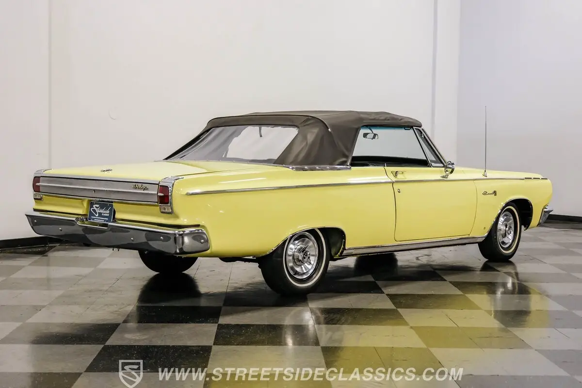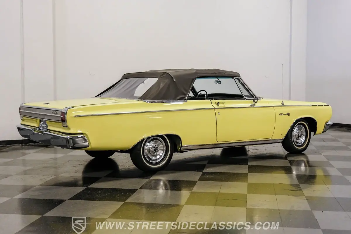 Fully restored and ready to hit the road, this 1965 Dodge Coronet 500 Convertible dazzles in vibrant yellow paint that radiates classic American muscle. The sleek body lines of this drop-top create an imposing profile, further enhanced by the black vinyl convertible top that folds down with power-assisted ease. The chrome accessories amplify the car's personality while exhibiting only minimal signs of age, maintaining their brilliant luster against the bright yellow backdrop. Rolling on 14" wheels wrapped in 205/75R14 tires, this Coronet maintains its factory-correct stance.