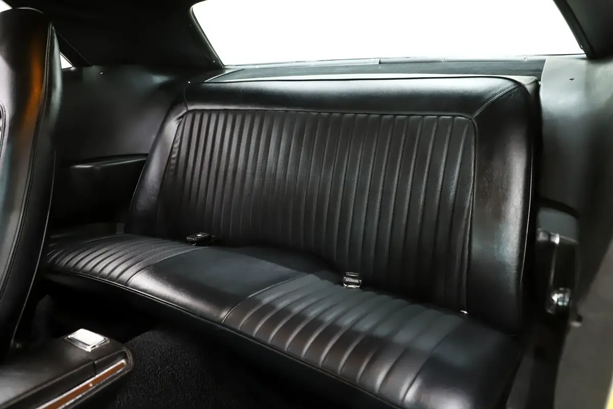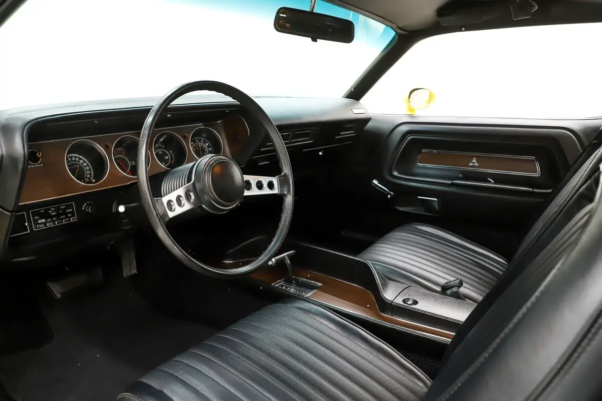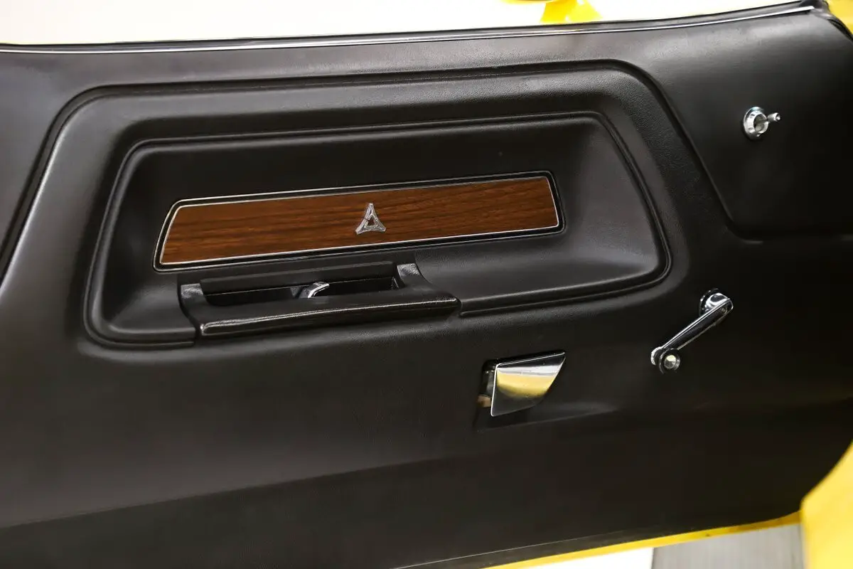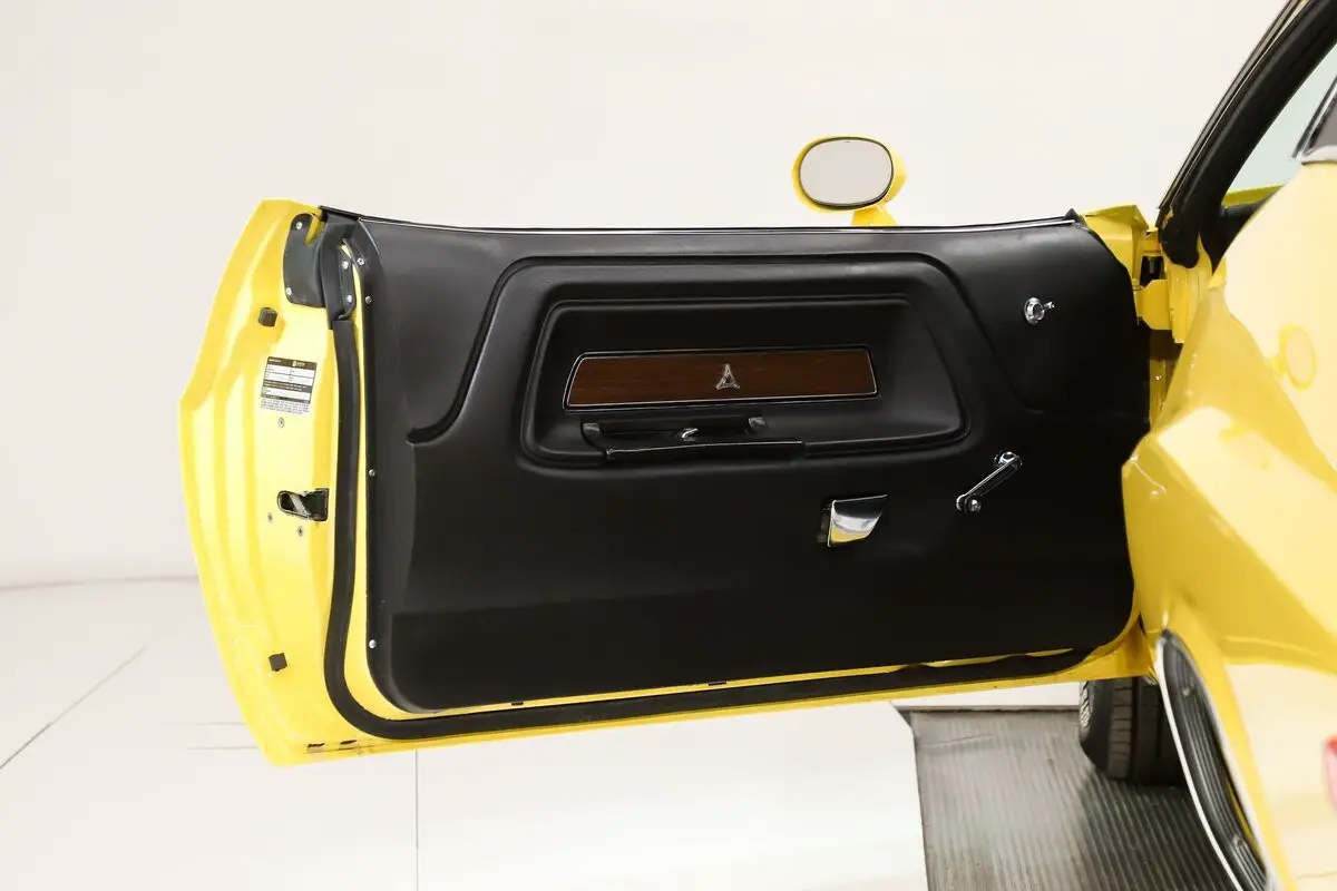 EXTERIOR: This is a sexy looking car! Great lines, eye popping color and stripes. The fit and finish is amazing, it is really straight. The panels fit precisely, I don't see any rust or damage. Factory the power bulge scooped hood and sport mirrors. The Top Banana Yellow paint is polished smooth like glass. Cool looking strobe stripe decals on each side. The vinyl top is replaced. All the glass is new. Up front the grill is restored, bumper, bezels, rubber fillers are mint. The rear bumper is new. The jambs are painted slick, weather strips and seals were replaced.