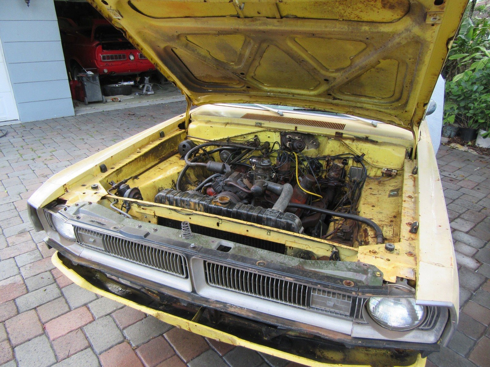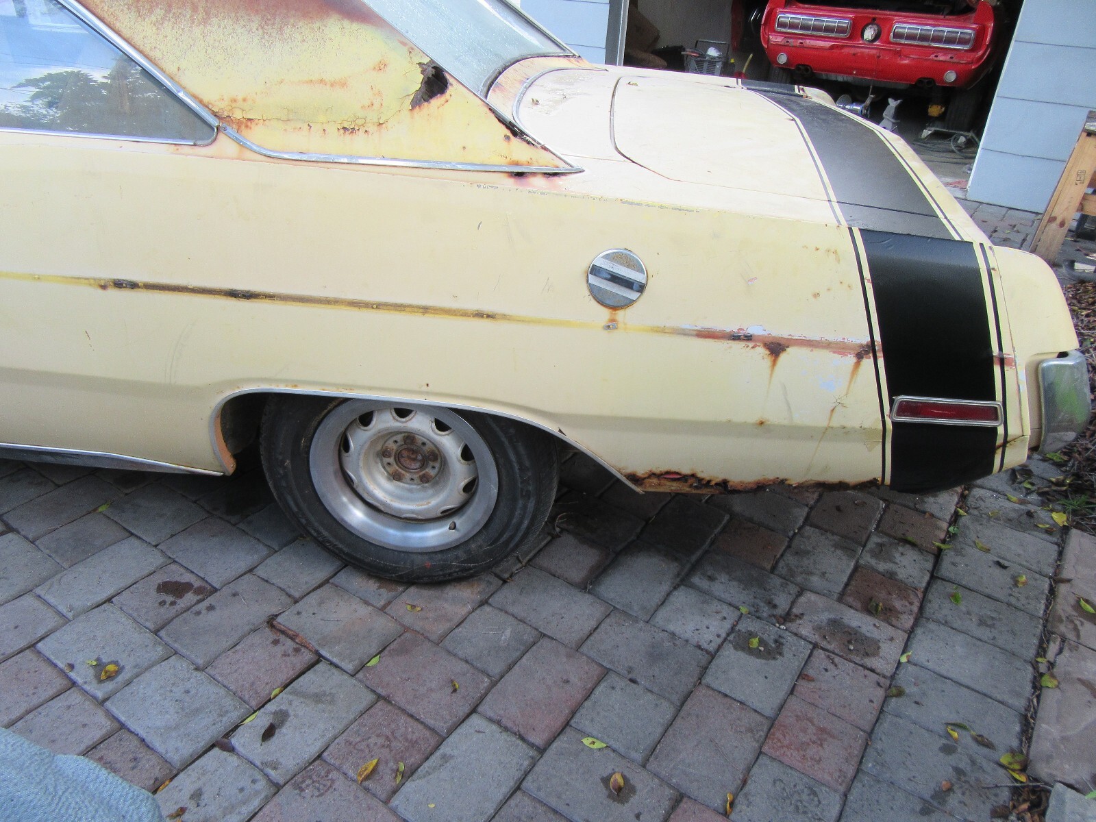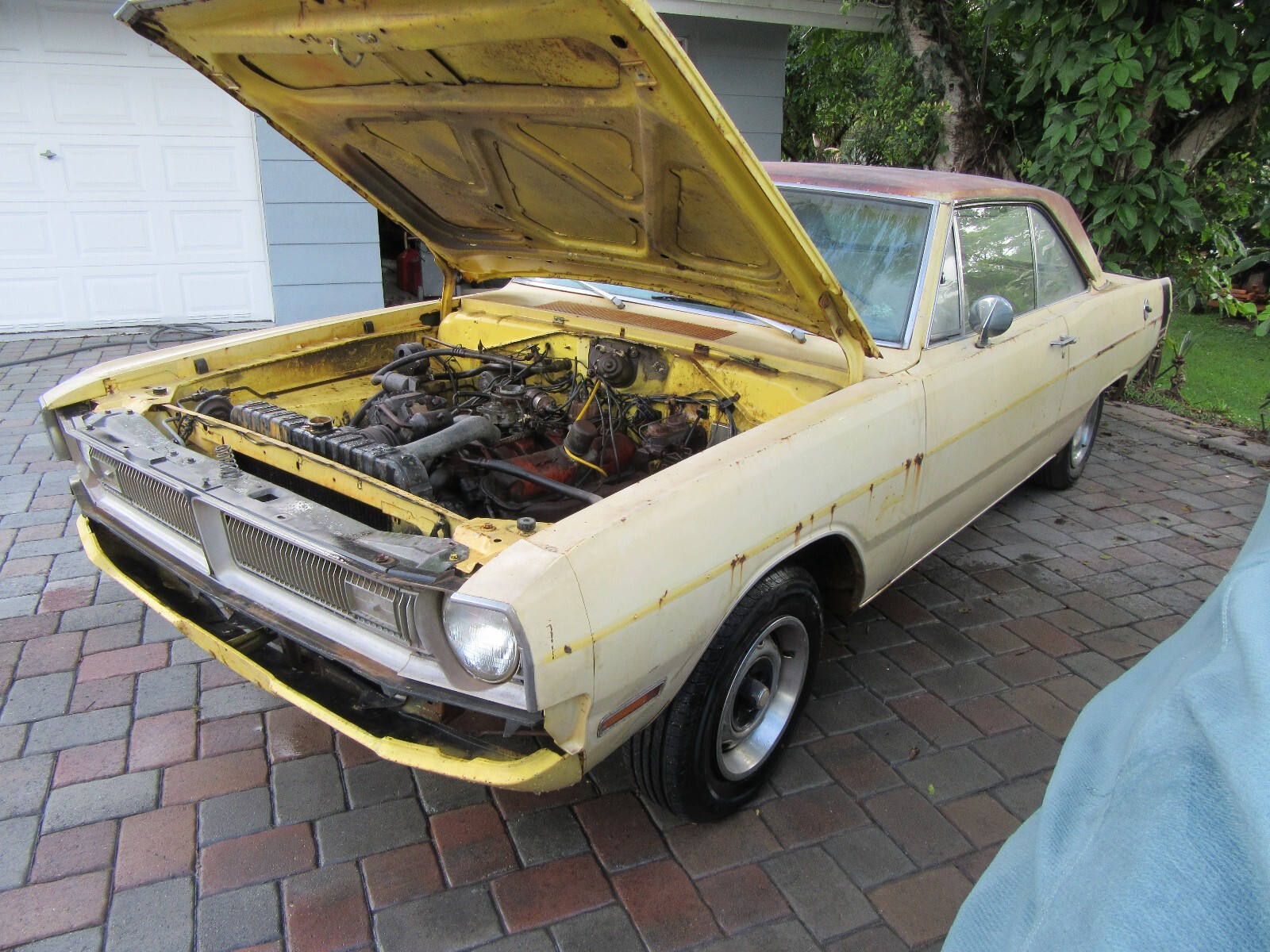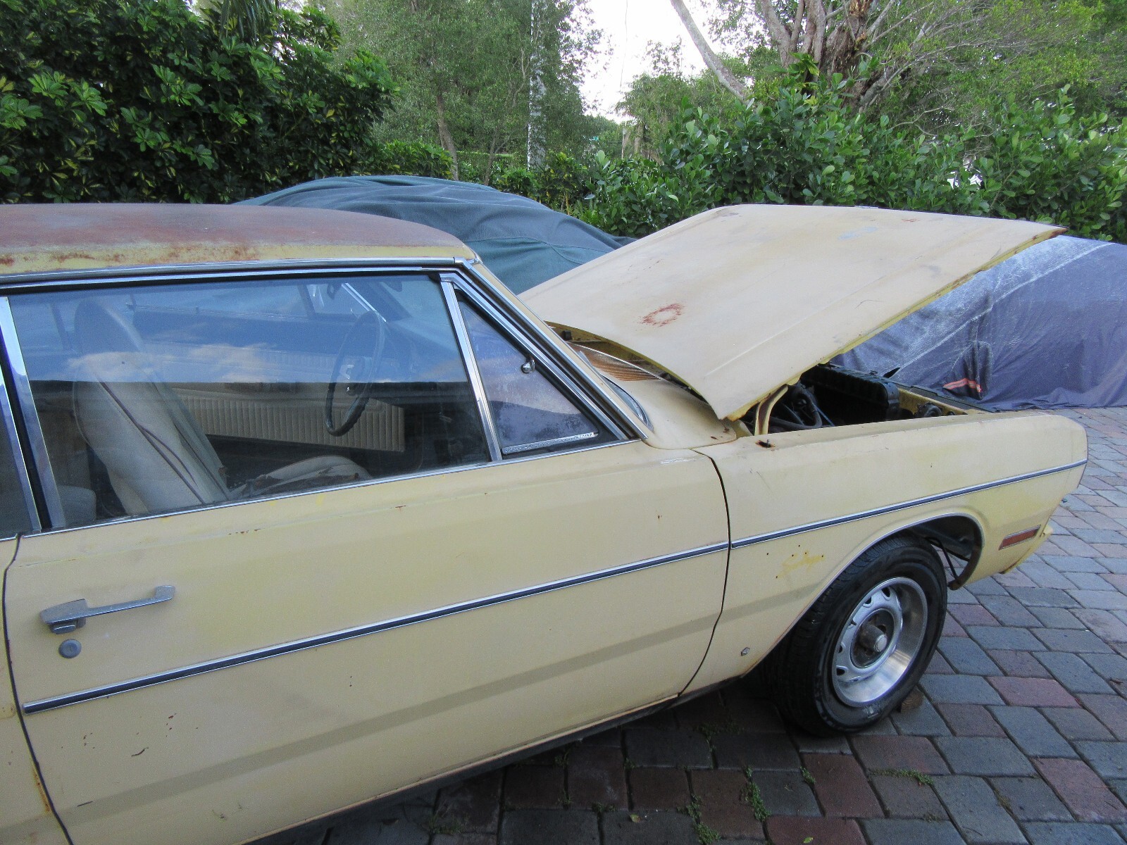 Here is a really nice optioned Dodge Dart Swinger. Factory Lemon Twist with a white interior. Non - Stripped and equipped. I took on too many projects at once and have to let some go. I will be glad to keep this car if it does not sell. Factory 318 V8, Automatic, center console, bucket seats, rally wheels (missing 1 center cap). It is in very decent shape. Other than a few rust spots, it is a very easy fix. It might be #'s matching engine and trans, but have not verified yet. All other numbers are matching and fender tag present. Have not tried to start yet, gas tank missing. Bumper in trunk. Hood latch missing. MAKE OFFER NOW AND IT IS YOURS. Nine54647566seven..... more pictures tomorrow at JunkorJewel.com a free spot.. Possible trade towards a Cuda or Challenger project or finished.