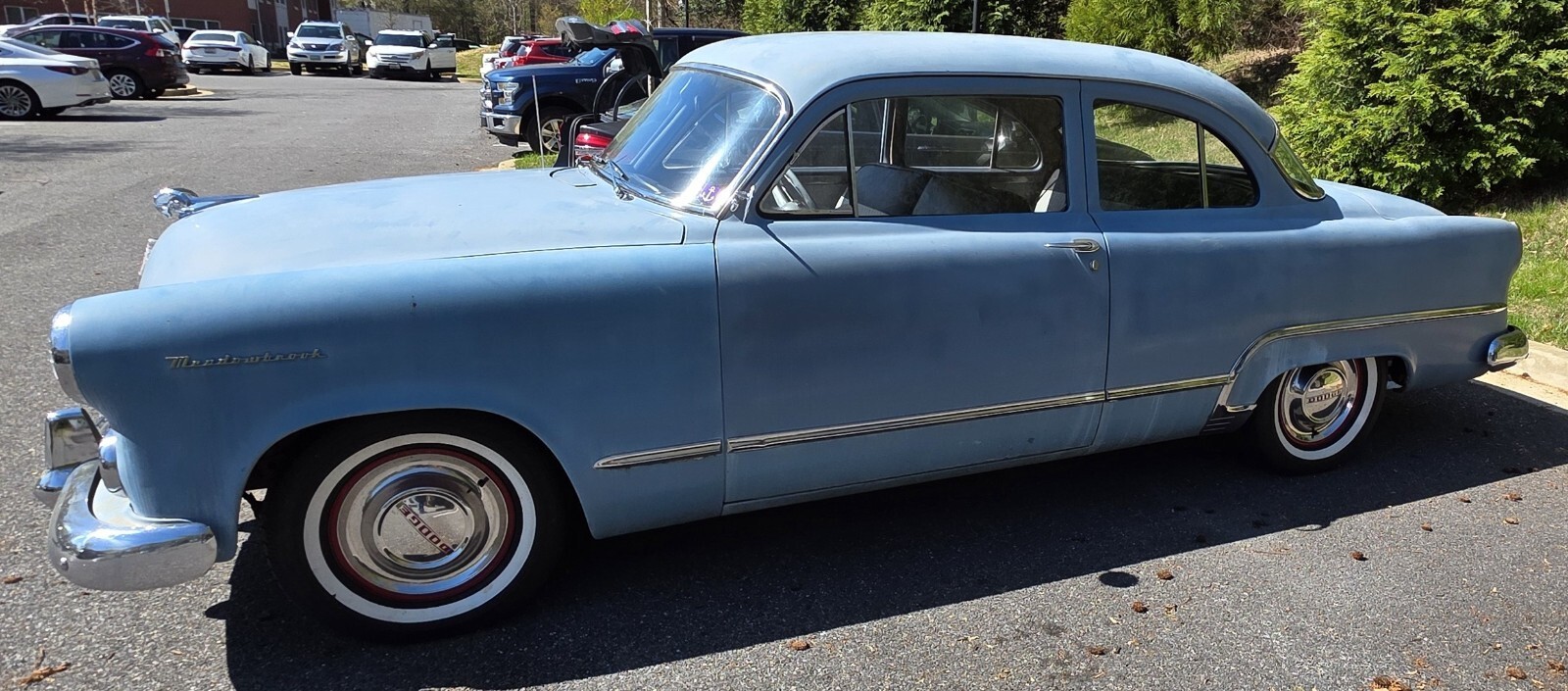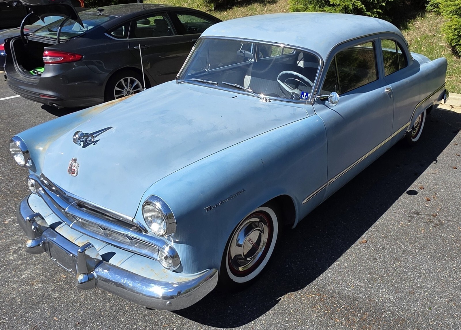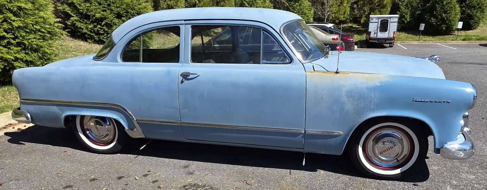 1953 Dodge Meadowbrook 2-door sedan in its original Arabian blue with a gray interior, and powered by the optional 241 cu. in. Red Ram Hemi boasting 140 horsepower and backed by a 3-speed manual transmission with overdrive. The car is being sold off as part of an estate, so the history is not complete. The mileage shows 24,500 (TMU).