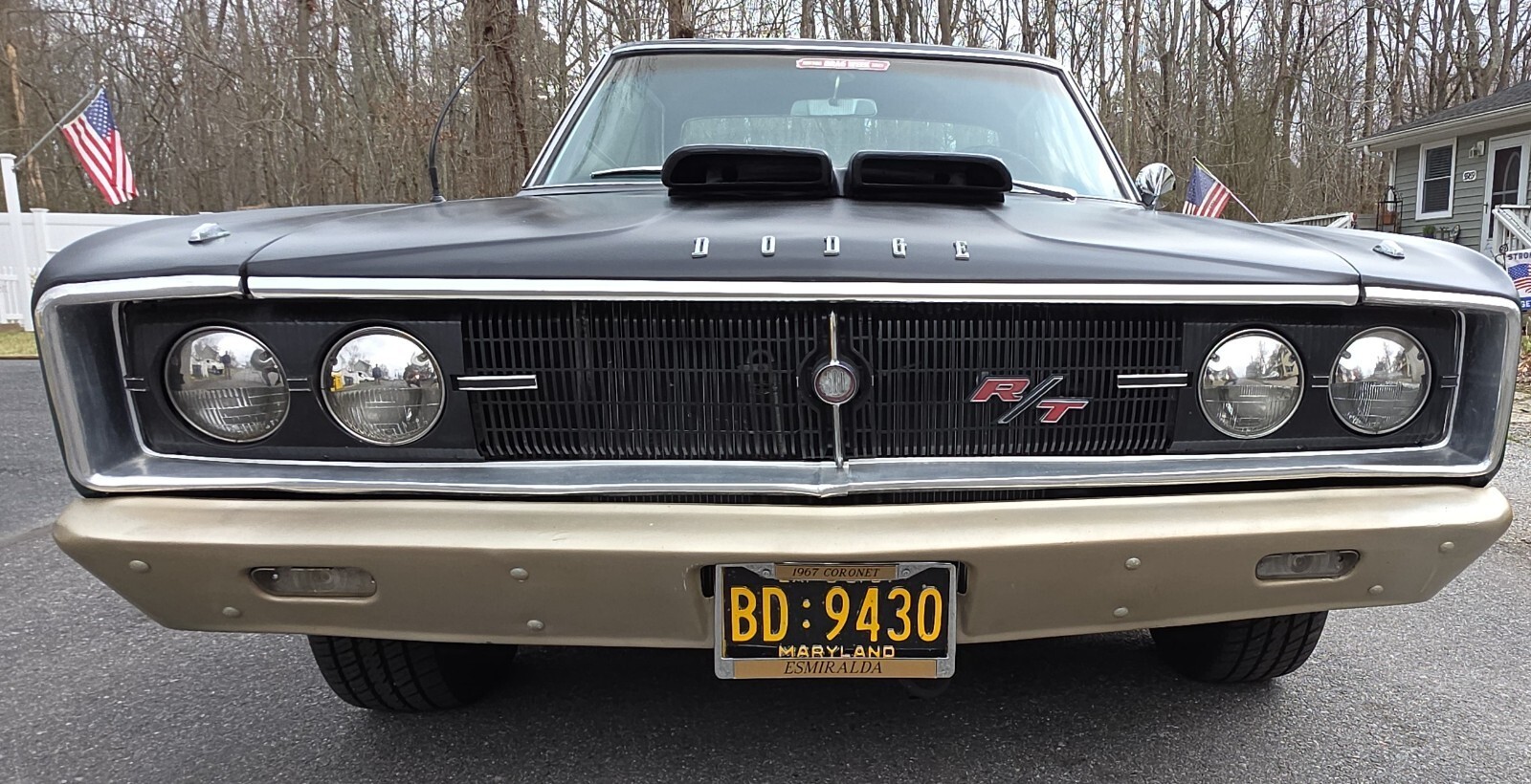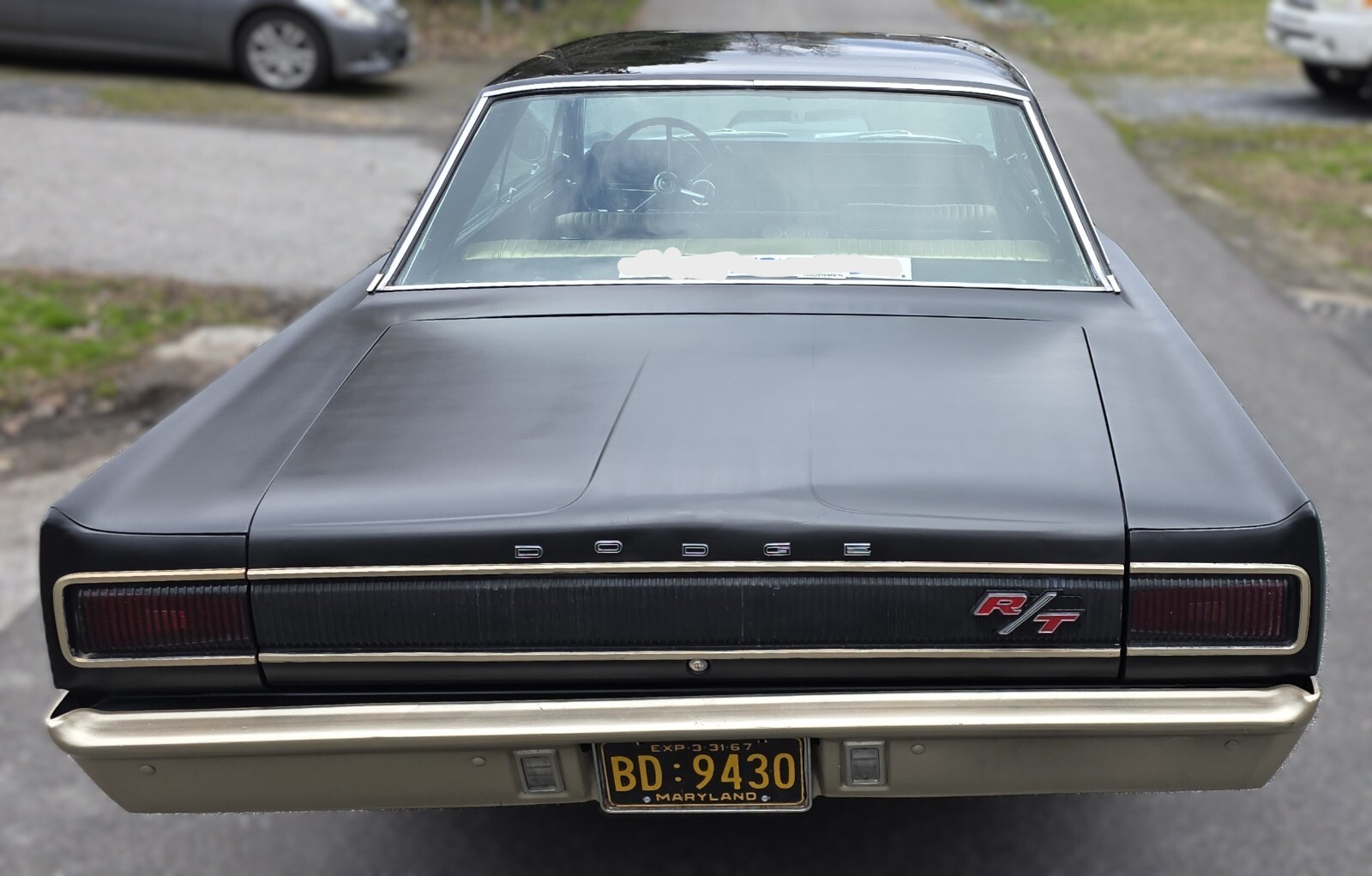 Overall, the Coronet body is solid and original. Mileage shows 60,000+, but no evidence of ‘bondo’ or replacement panels. 1970’s vintage Mopar hood scoop. You can see side trim holes under the red striping on each door. Finish is a ‘Hot Rod’ flat with a gloss black top. All glass is in good condition and goes up and down easily. Outside lights function as well as the wipers. Chrome bumpers are painted and the rear taillight section shows some pitting.