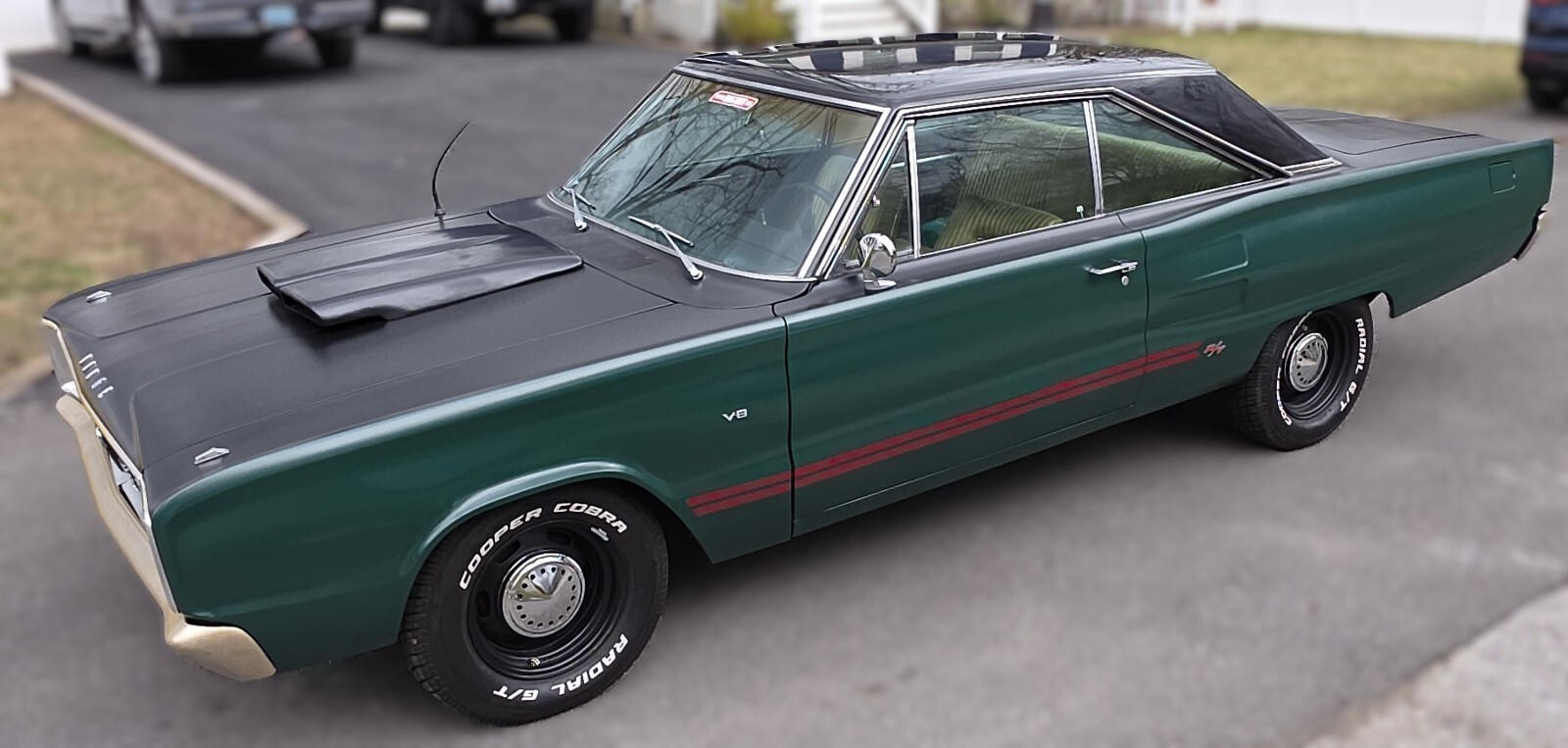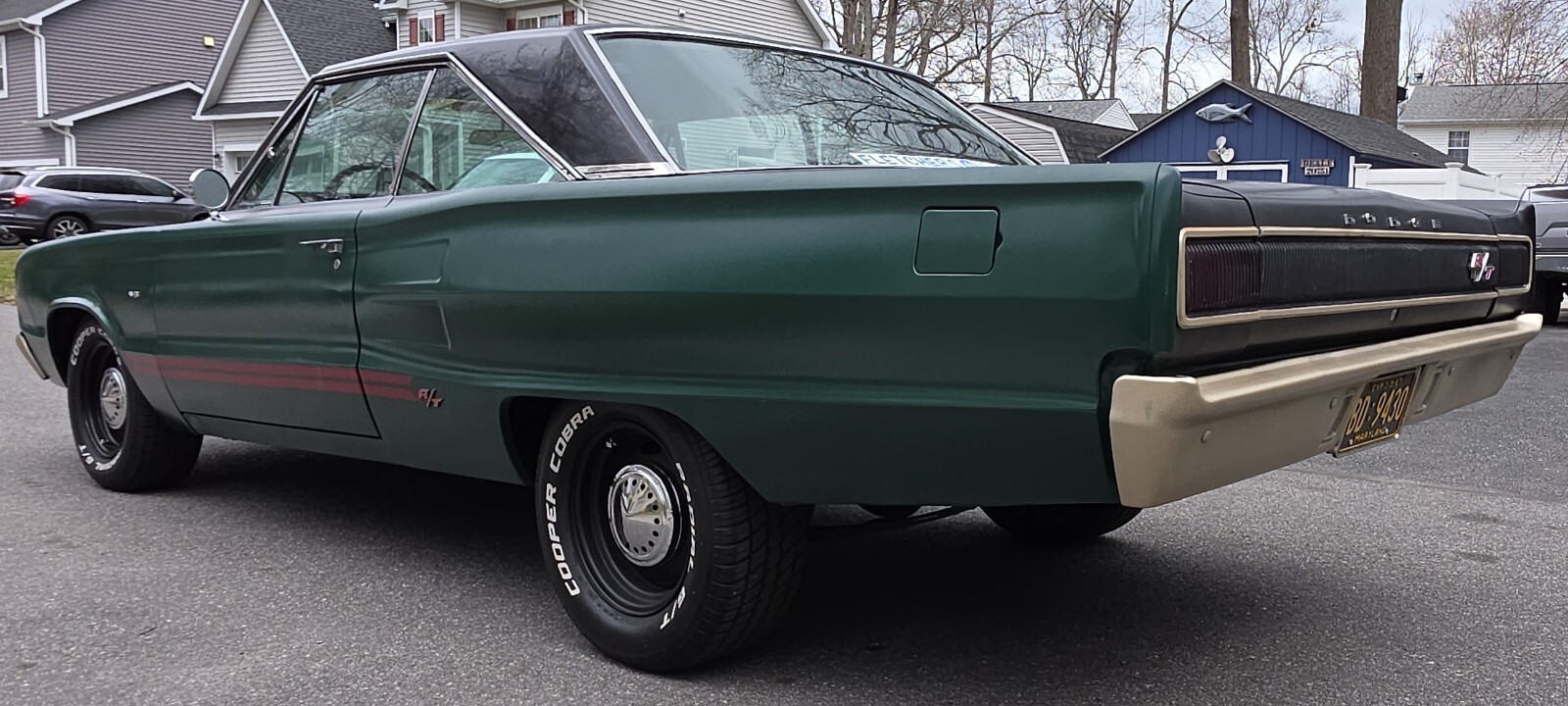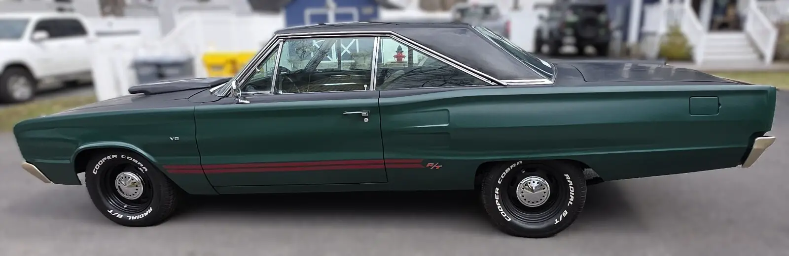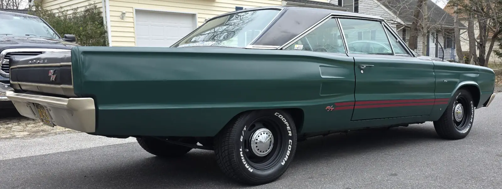 Stock Dodge Coronet suspension with new ball joints and complete brake system (drums on all four corners). Air shocks were added in the rear. 8.75” rear differential housing new 3.55:1 ring & pinion with posi-traction. Cooper tires measuring 225/70R/15 up front and 255/60R/15 rear on stock 15” wheels with ‘dog dish’ hubcaps.