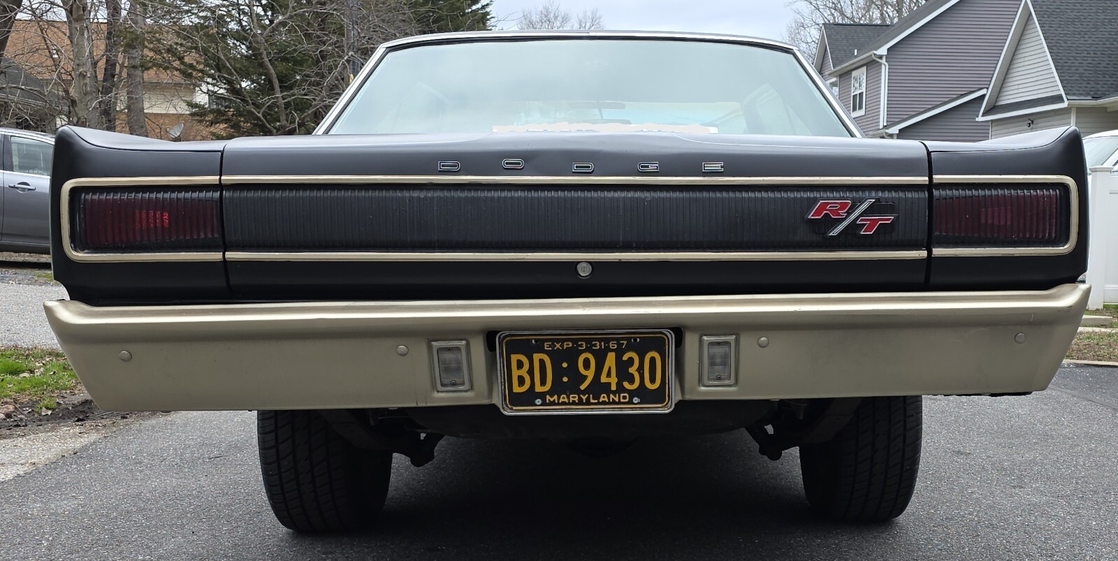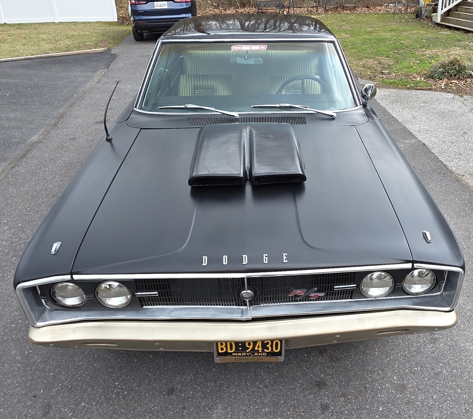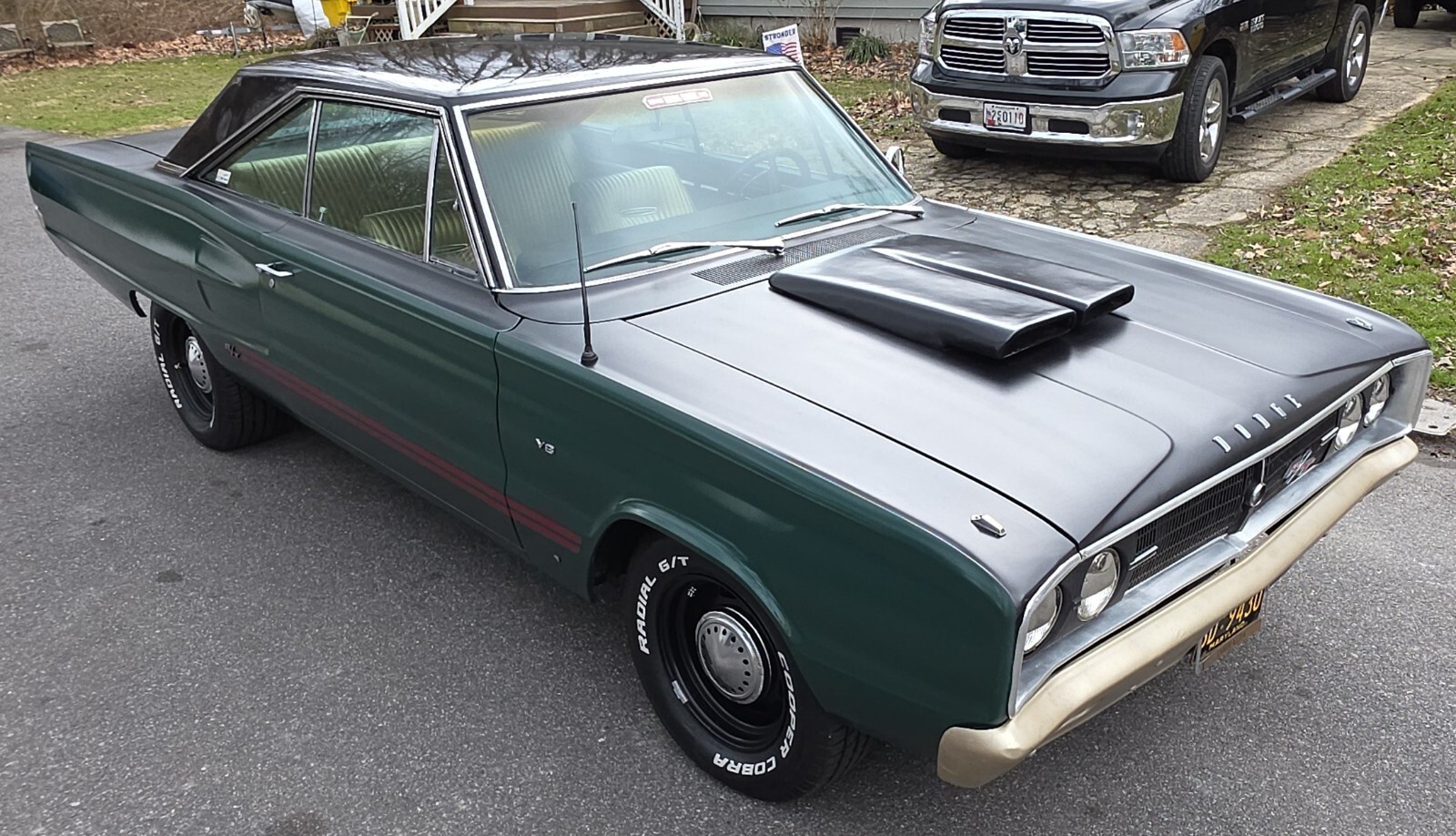 Stock Dodge Coronet suspension with new ball joints and complete brake system (drums on all four corners). Air shocks were added in the rear. 8.75” rear differential housing new 3.55:1 ring & pinion with posi-traction. Cooper tires measuring 225/70R/15 up front and 255/60R/15 rear on stock 15” wheels with ‘dog dish’ hubcaps.