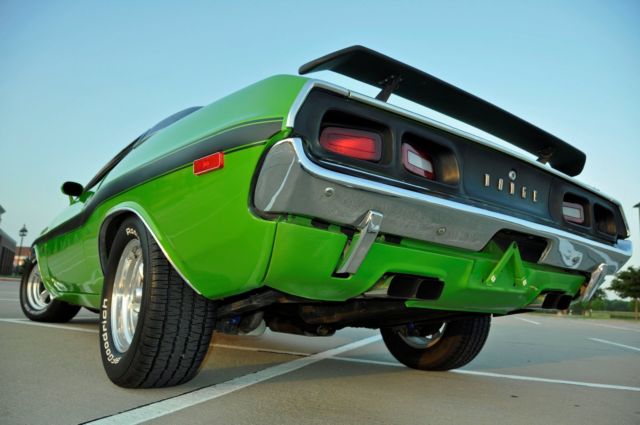 Previous True RalleyRed/Black automaticChallenger(see Fender Tag options on that below)- Restored over last 6+ years to be what it is today. Basically a1970-1971 RT Clone with a 383, 4 speed with Pistol grip Shifter. Green, w/black R/T striping/badges. Really in amazing shape, drives just smooth and straight. Full strip down paint and restoration years ago. 1 little area with some surface rust under paint(minimal) in front of driver rear tire.Pans andundercarriage clean, great black vinyl top, no tears in seats, perfect carpet. Am/Fm w/6x9's, brand new BF Goodrich's on back, 75% tread on front BF Goodrich. American Torque Thrust wheels with low stance.