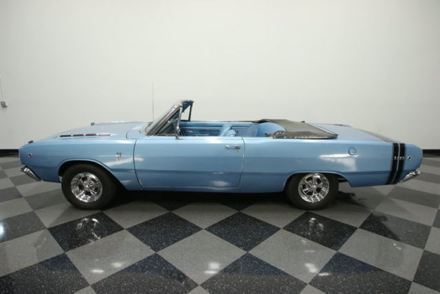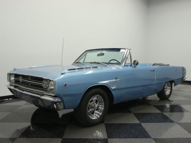 Can you believe you can get this cool cruising convertible for under $23K?! After all, we all know Mopars are the rarest of Detroit's Big Three, and this 1968 Dodge Dart GT convertible is thoroughly complete, and it even has the correct V8 with great performance upgrades.The Dart has always been the blocky looking bad boy. Because this is a convertible, those GT badges are legit. The bodywork on this one has remained straight and angular after all these decades, and the finely creased sheetmetal is far more clutter-free than its contemporaries. This has allowed the factory-correct light blue paint to be the perfect canvas for the more aggressive darker elements like the rear sports stripe package and the new power folding black vinyl top. But this doesn't mean the brightwork can't be aggressive, too. Just look at those hood vents and Cragar SS wheel...That's pure intimidation.The exterior blue pant is a great introduction to the metallic blue vinyl inside. One look at this design and material, and you know it can only come from the '60s that's exactly the first impression you want your classic convertible to make. It's ultra-clean inside, and so it's obvious that someone who really loved this car was in charge of its maintenance (also important for the first impression.) The blue on the seats coordinates nicely with the carpets, dash, and the door panels that have the proper GT badging. The sea of blue is broken up by the bright center console that runs in-between the bucket seats and really sets off the interior. Plus, there's plenty of distinction on bright features like the original heat/defrost controls, AM/FM radio, and the inner ring of the large factory steering wheel. When you open the hood, you'll love seeing the big V8 greet you with the shiny chrome air cleaner that announces it's an extraordinary Mopar. The top GT engine in 1968 was the 273 cubic-inch V8, and this one stays true to that history with what shows signs of being the original block. This V8 fires right up with enthusiasm, the four-barrel carburetor and Edelbrock Streetmaster intake give you an extra wallop of power, and the dual exhaust lets them all know there is some real muscle behind this blue machine. On the road, the Torqueflite three-speed automatic transmission has that perfect balance of easy cruising for the everyday, and reliable performance when you want to hammer the upgraded V8. Thankfully, the stout 10-bolt rear end can handle it all. The Michelin X tires make sure you have good modern grip, and the whole package is setup to make sure the driver stays connected to the road.When you realize how rare, nice, and complete this convertible is, you'll do a double take on the price. So we could tell you to hurry up and get this Dart GT, but you already know it's going fast. Call today!!!