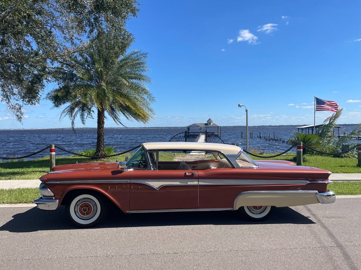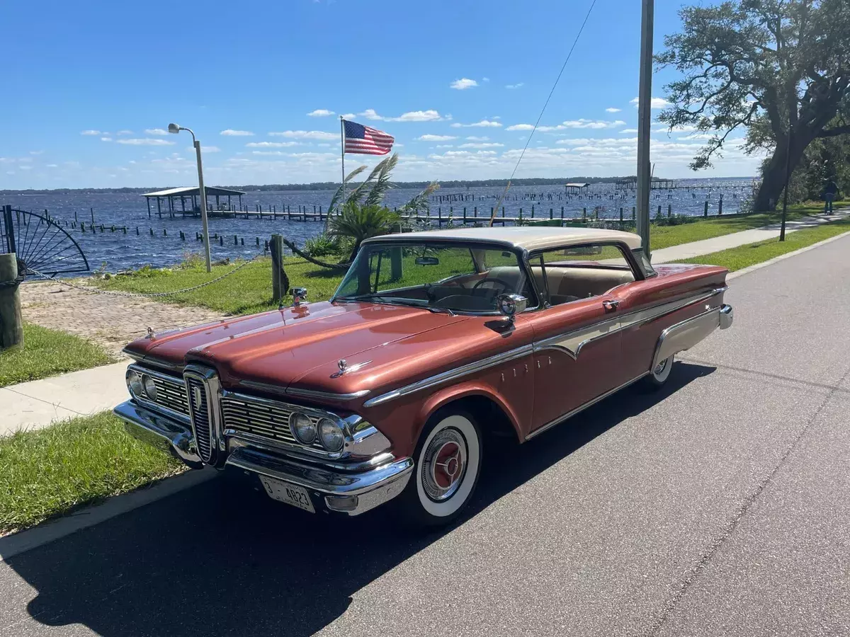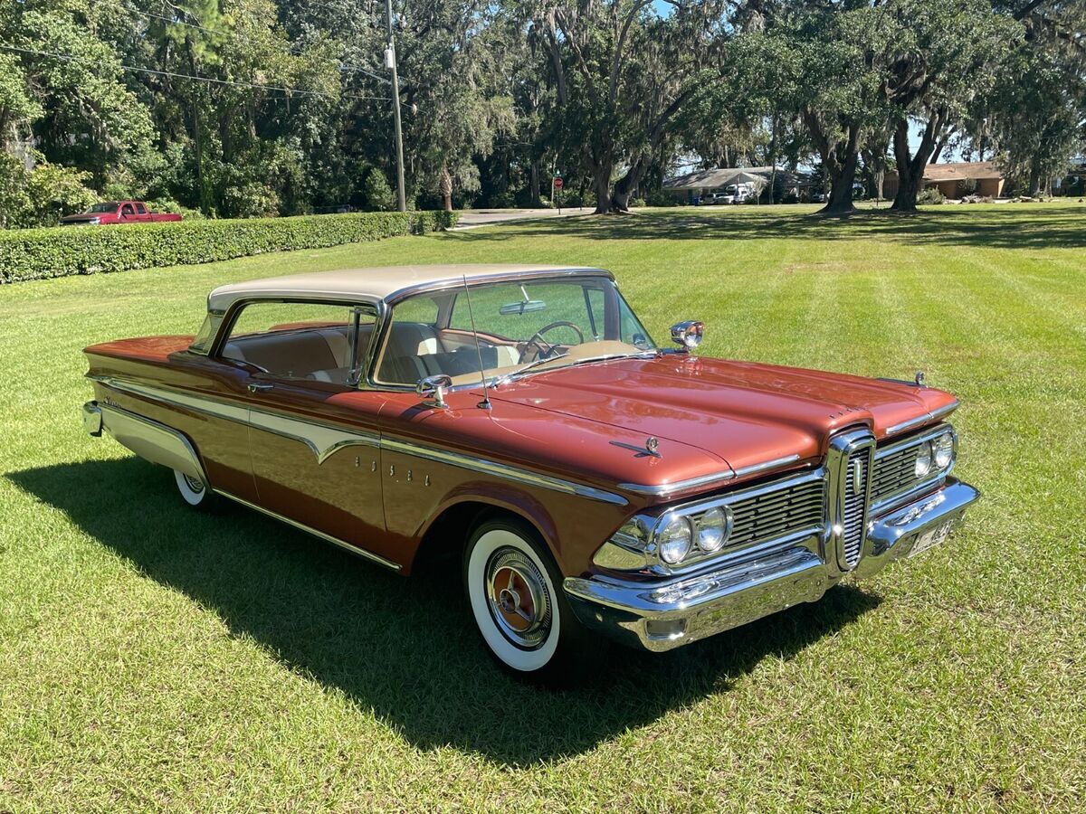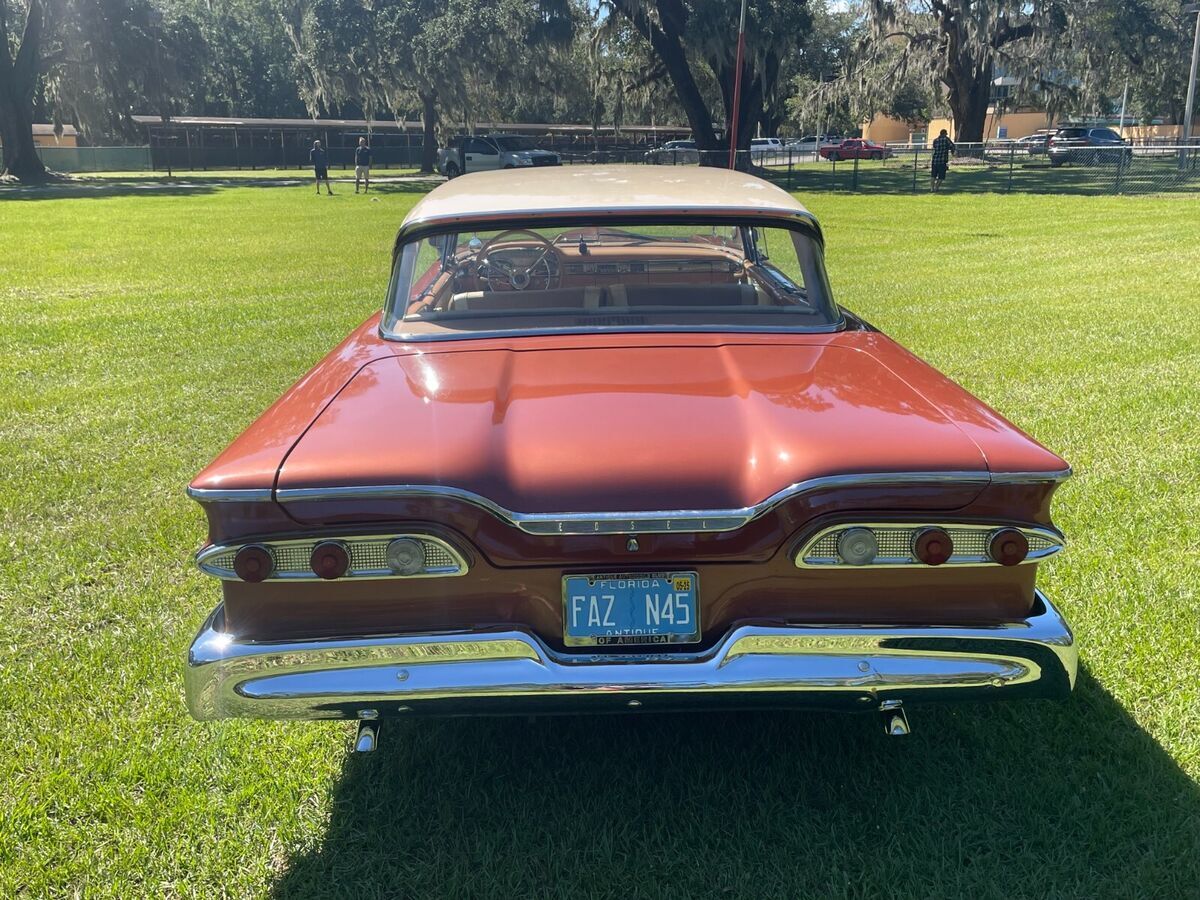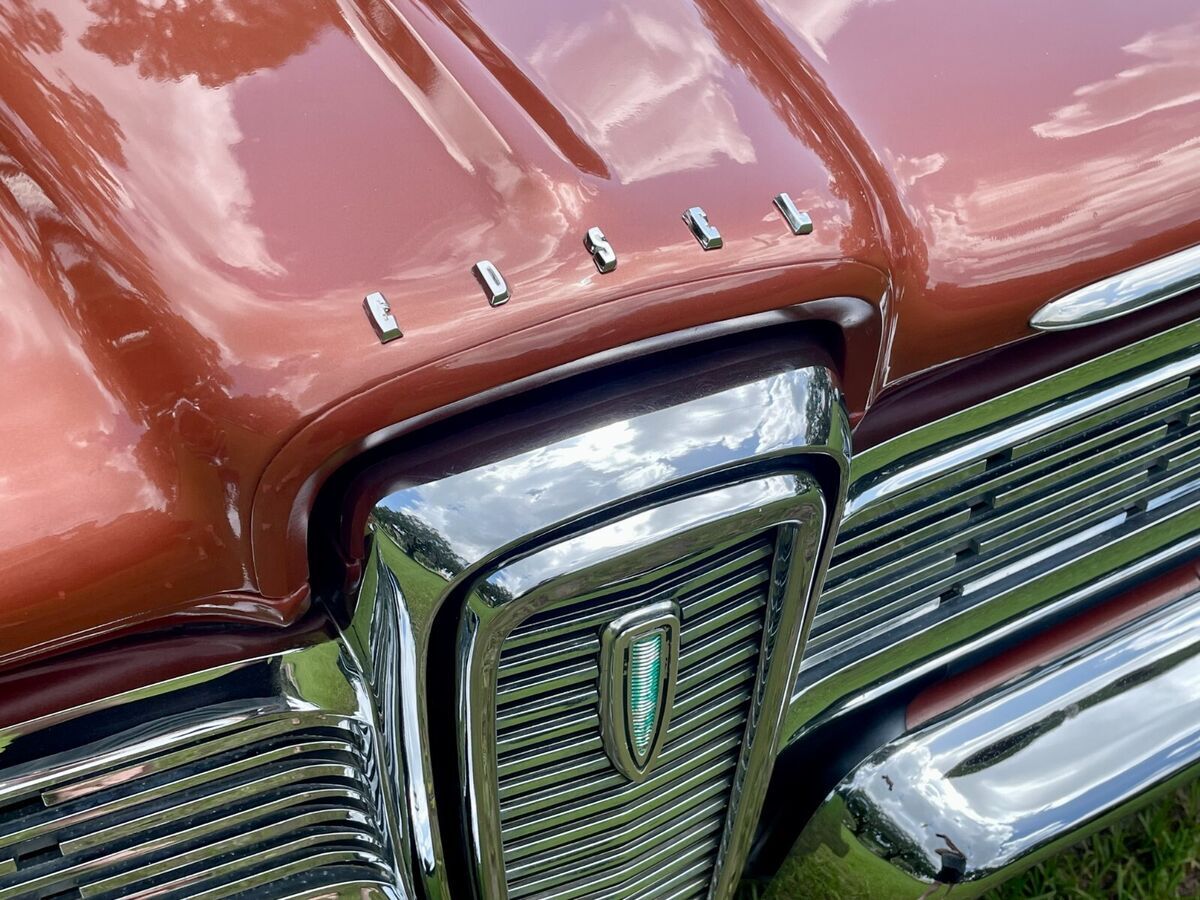 The photos tell a great story. Just a beautiful car inside and out! The original colors of Redwood Metallic and Desert Tan really stand out in a crowd! There are some minor flaws/touch up areas due to normal age and driving, but the finish looks very pretty overall. The interior/upholstery could be factory original and it's in amazing condition for the age of the car. The styling of the inside of the car is just exceptional everywhere you look. Beautiful original dash and steering wheel! All of the glass is in good condition, the windows are tight, and roll up and down easily. The doors shut exceptionally well with a nice THUD. Engine compartment and trunk are nice and tidy looking for your car show display. Underneath the car looks great also. Comes with the original owners manual and dealer folder, a copy of the original invoice, and a nice car cover. Also check out those MATCHING CHAIRS that come with it!! This Edsel is sure to be a hit at all of your local car shows. It has many trophies yet to win.