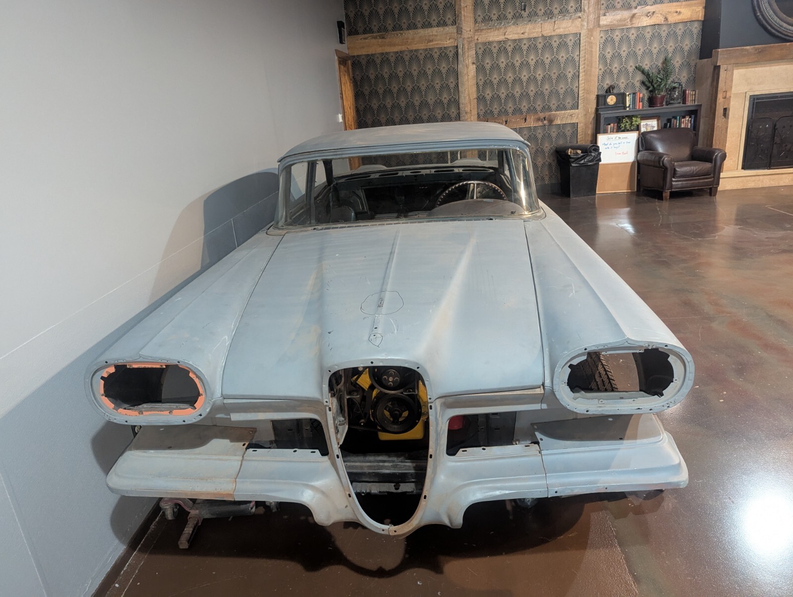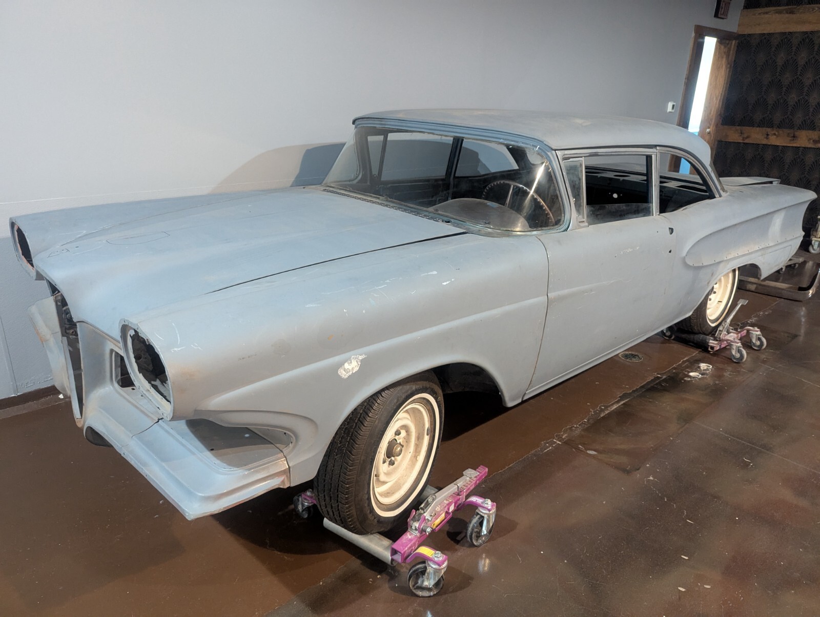 1958 Edsel project car. This car has already been started on the restoration but it looks like it has been a while back. First off this is SOLD ON A BILL OF SALE I HAVE NO TITLE FOR THE CAR BUT THE VIN TAG IS STILL PRESENT W8UC727453. that breaks down to a V8 engine E-400 361CID, 4 barrel 303 HP which is an impressive engine for 1958. According to the last owner the engine has been rebuilt and he let me hear it run and it sounds great, I havent started it only the last owner I would say you wont need the engine rebuilt it will work as is and the tranny is in the car but I never saw it drive. This is a Ranger 2 door Sedan and what I am most impressed about I have seen absolutely zero rust. The bottom of the car looks amazing and it looks like someone either media blasted the bottom of the car and frame or sanded it down and then painted it black because it looks really nice and some minor touch up and you can leave the car as it is. Also I have one picture of the bottom of the door and there is zero rust on the bottom of the door. The trunk has zero rust, all the panels have zero rust. I am a body guy and looked the car over pretty good and I wont promise you wont find any but for sure you wont find much. I cant believe how clean the sheet metal is for a 67 year old car. I wish every car I started on was this clean. It also looks like at one time they put on new shocks, and a lot of the parts on the suspension. It has been awhile back but most of it still looks nice and usable but I'm sure there are a few things that need replaced. I see new soft brown carpet in a box, I see an off white new headliner, the previous owner told me the radiator was new but it looks like its been sitting around for awhile and got bumped a few times. Also new door whiskers, I see the push button items that go in the center of the steering wheel. I dont have any seats those are missing, also I dont see a front bumper but I do see a rear bumper. Looks like most if not all the chrome and stainless is with the car, the grille and front headlight parts and all the tail lights and turn lights are with the car. All the glass is there and looks to be in good condition. I also see brand new wheel skirts if you want to install those. The tire tread looks like brand new but I'm sure they have been sitting around for many years so I dont know if they are good or not. The body has a few dings and dents and I am guessing that is from sitting around all these years but overall the body looks amazing and it wouldnt take much work to fix the small dents and sand it down and paint it. It looks like the guy bought double of a lot of the parts, I see two fan blades, two water pumps, and on and on. I know these cars arent worth a fortune that is why this would be the perfect project car because it is already running and will only need minor work if any on the engine, the bottom of the car and frame have already been painted so they will only need minor work if any, the suspension is nice so it will only need minor work. No body replacement panels and just minor work on the body in order to get it ready to paint. Plus the majority of these cars I see are 4 door and this one is the more desirable 2 door car and it has a heck of a cool engine in there. Feel free to give me a call if you want me to take a picture of something or look over something but dont call and ask any technical questions because I am a body guy and wouldnt know about the mechanical items other then what I can look at. Thanks Kevin Manley Kevin's Klassic Cars 612-275-8722 P.S. I dont know why it says it has the 292 engine but everything below the title is wrong this has what they call the E-400 engine 361CI 303 HP.