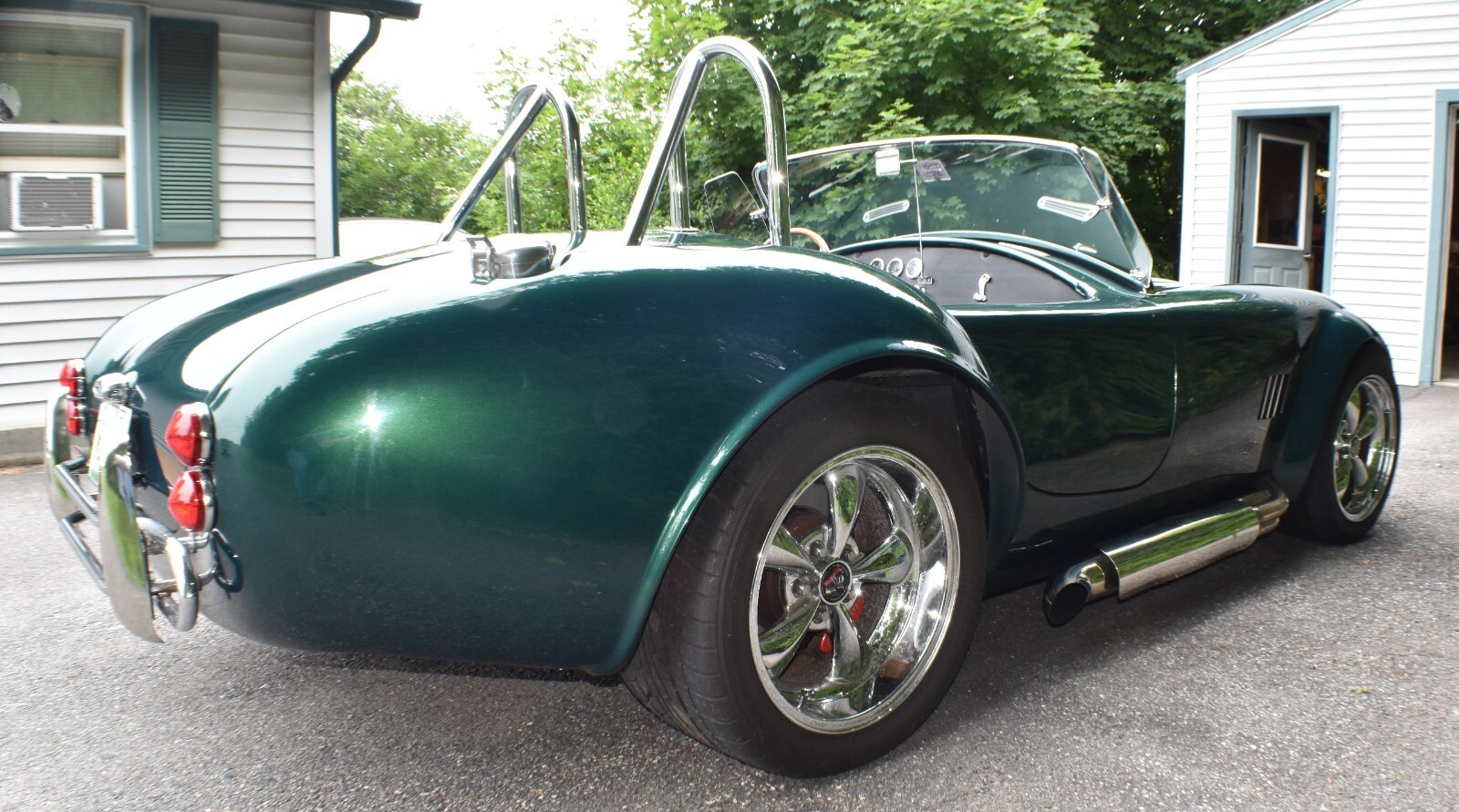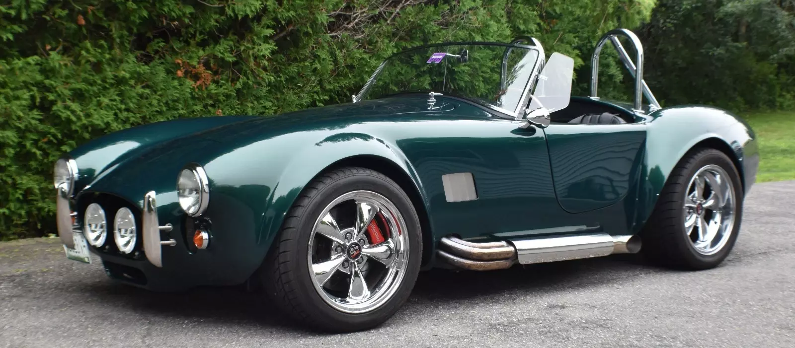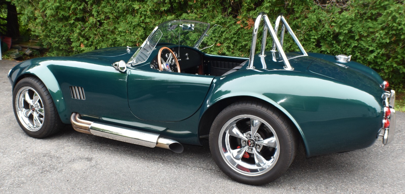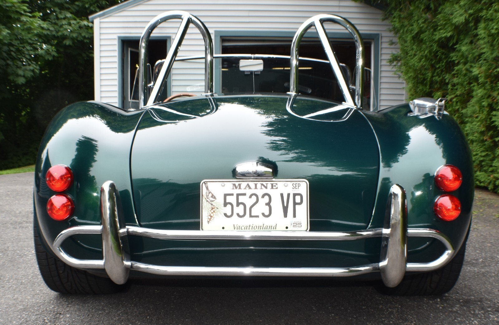 FFR fiberglass body painted in a 2-stage Jaguar British Racing Green. Optional dual chrome roll bars. FFR wind wings. Chrome rear bumper and 8” Hella driving lights.