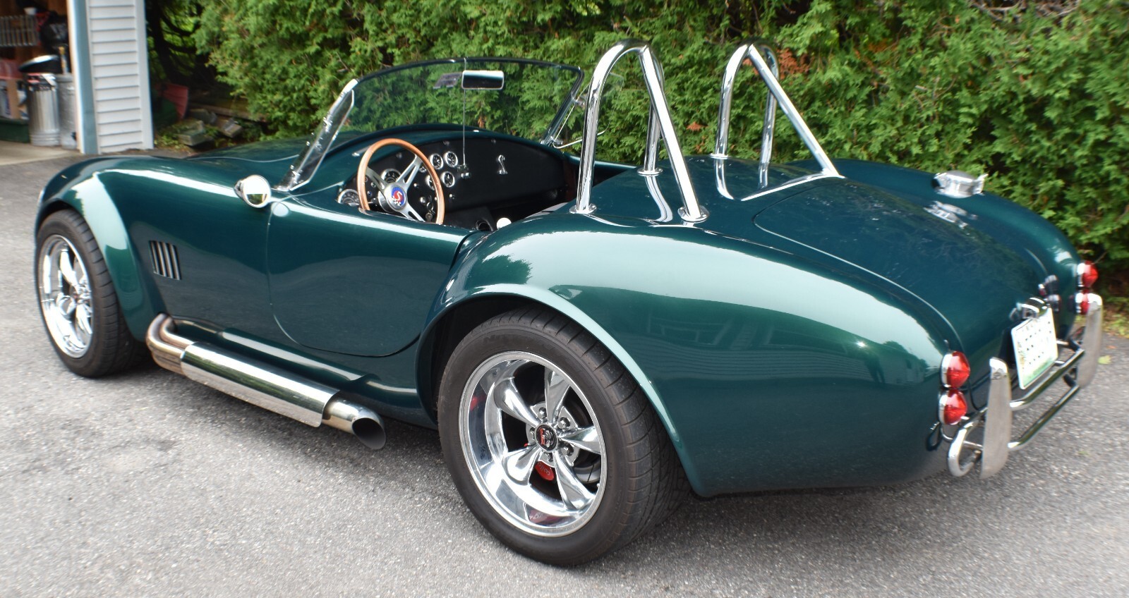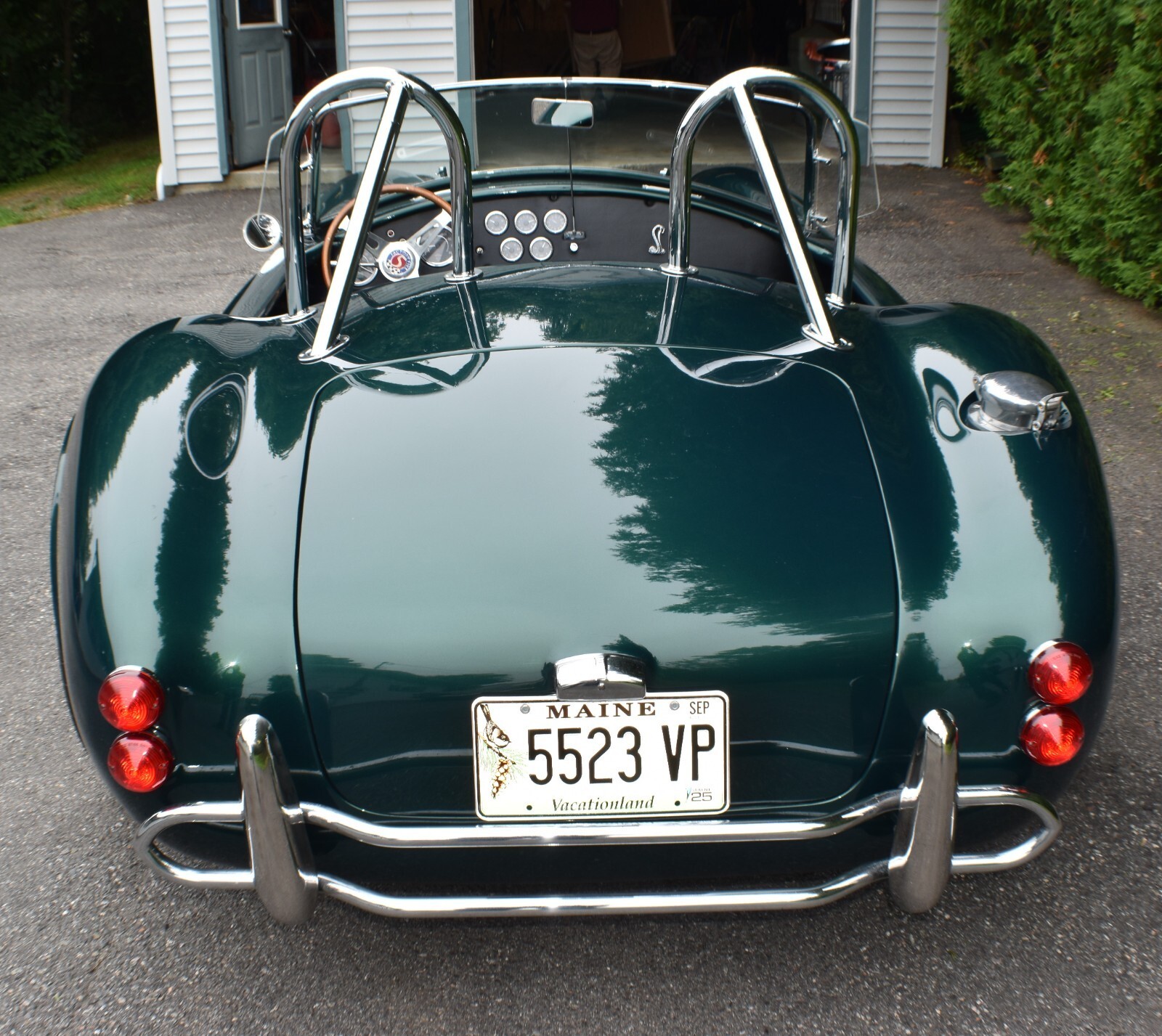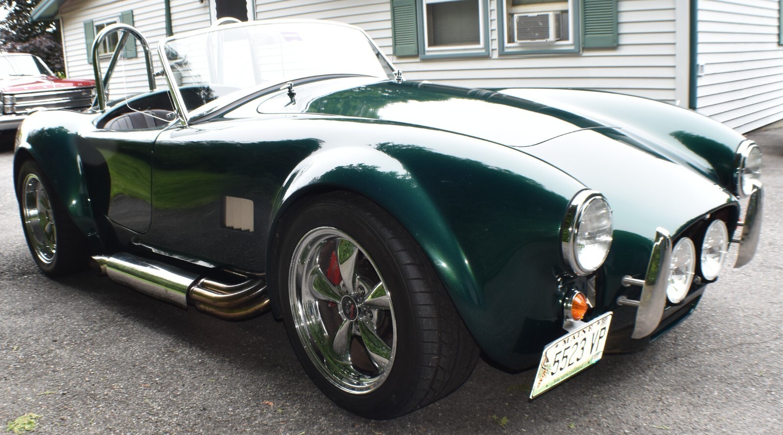 FFR fiberglass body painted in a 2-stage Jaguar British Racing Green. Optional dual chrome roll bars. FFR wind wings. Chrome rear bumper and 8” Hella driving lights.