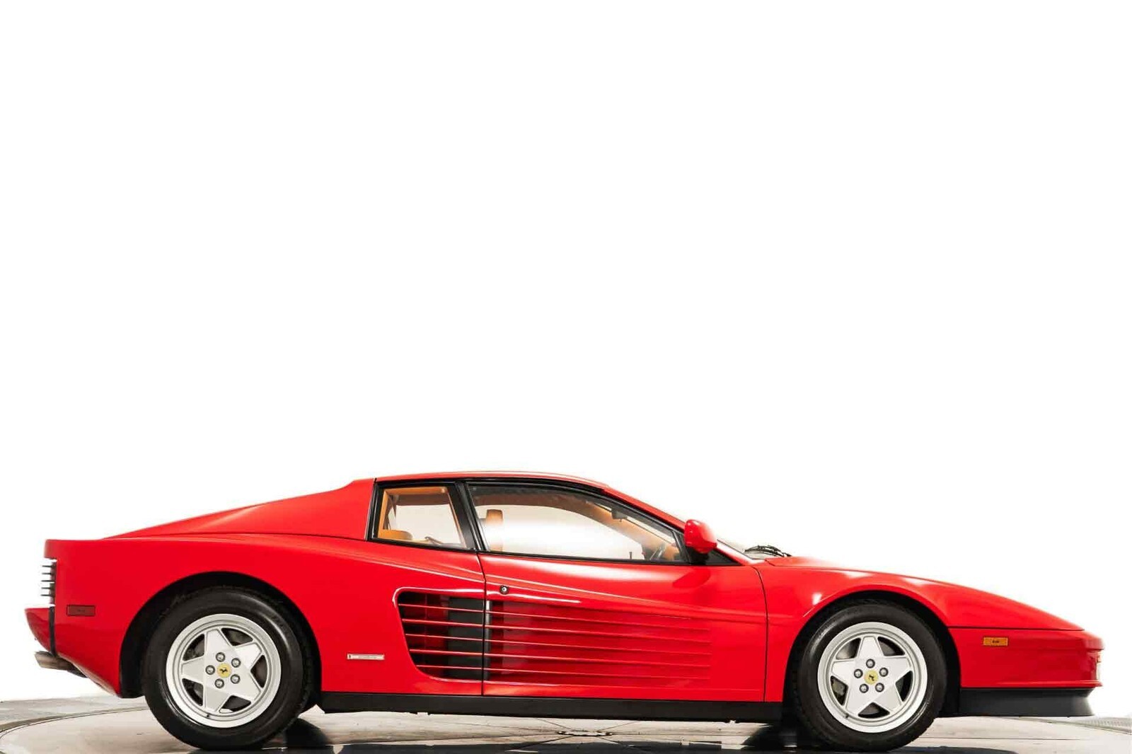 1990 Ferrari Testarossa in Rosso Corsa over Beige leather interior and only 8,045 miles. This Testarossa is loaded with: 5.0 liter DOHC flat 12, 5 speed gated manual transmission, 16 inch 5 spoke wheels, a Pioneer head unit, tools, jack and belts kit, floor mats and much more. This Testarossa just received a full engine-out belt and fluid service.