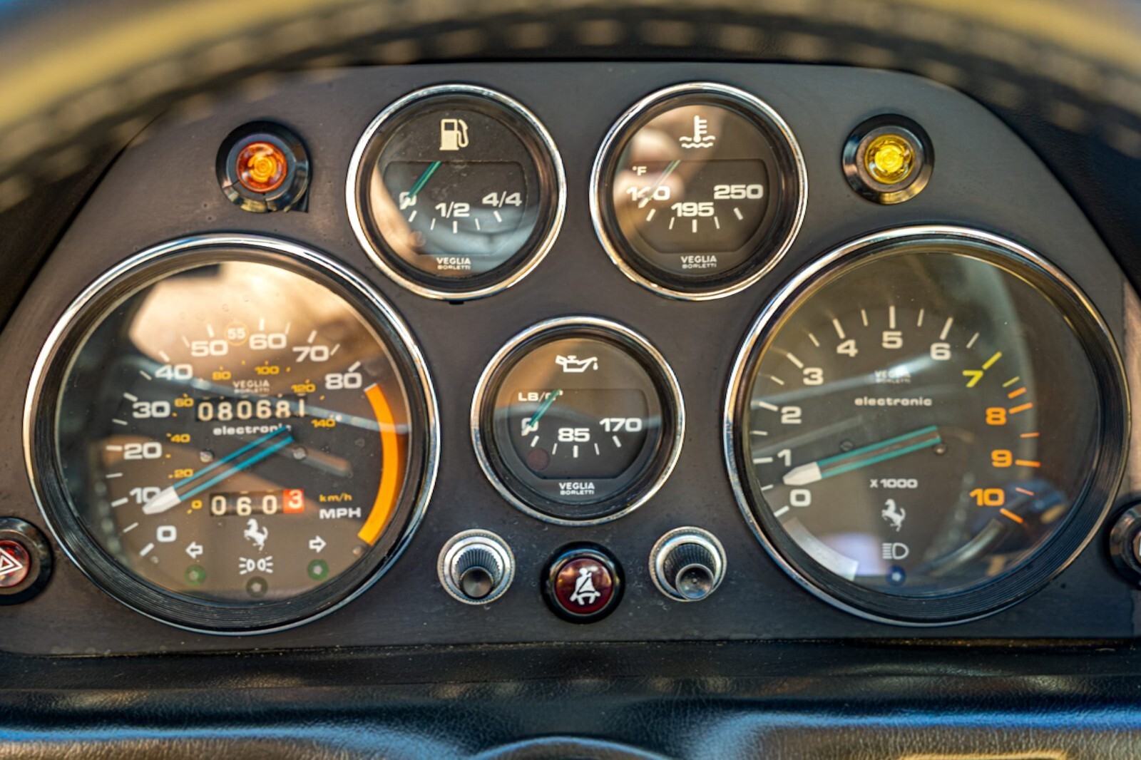 The leather-wrapped Nardi steering wheel fronts Veglia instrumentation including an 85-mph speedometer, a tachometer with a 7,700-rpm redline, and supplementary gauges. Additional readouts are mounted ahead of the shifter. The six-digit odometer shows 81k miles.
