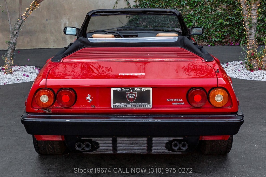 This Mondial is equipped with a 5-speed manual transmission paired to a V8 engine featuring Bosch K-Jetronic fuel injection. Additional equipment includes a black convertible soft top, quad exhaust outlets, four-wheel disc brakes, retractable headlights, side air intakes, Cibie fog lights, and a gated shifter, an iconic Ferrari detail. It rides on 17-inch alloy wheels with Ferrari-branded center caps and includes a jack, tool roll, and full-size spare tire.