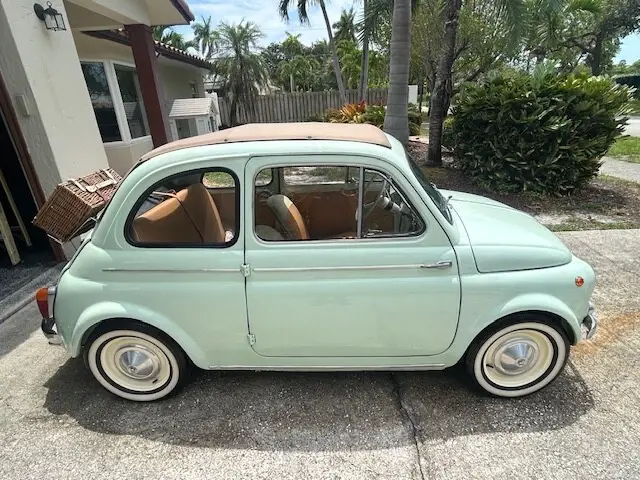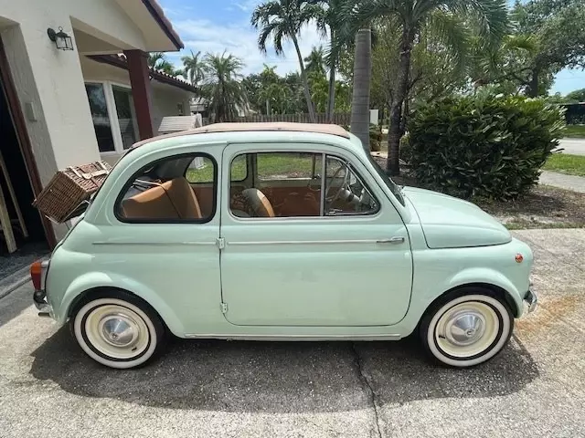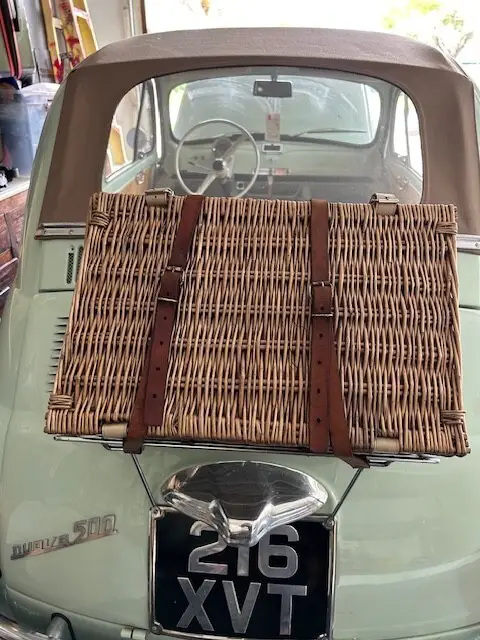 gearbox ( non-synchromesh and requires double clutching), so this upgrade is absolutely necessary . 3.4 piston calliper Disc brake conversion. Both Front and Rear Drum Brakes converted to Disc Braketo provide superb Braking performance and safety when driving.4.Electronic ignition. No hassle with point gap etc and cold start issues.5 . Electronic fuel pump6.Uprated suspension that improves ride quality and comfort.7.The design and pattern of the original Vinyl seats were replicated and the finest Italian Nappaleather was fitted to keep appearance as original. The seats come with matching floor mats withivory piping. The door cards are alsoleather.8.The car features the ‘ Transformable extended softop that folds down to the top of the enginebay. This is a desirable feature for collectors . The original Vinyl soft top material was replaced with aItalian manufactured Mohair softop matching the interior of the car.9.Picnic hamper carrier with a wicker basket set for 4 people10.Toolkit with jack11.Uk registered supplied with Classic Italian Style Plates.12.12 inch white wall Tyres13.Rare Fiat 500 Model Dashboard decal14.One of the best sounding Bang and Olufsen wireless speaker with Bluetooth that offers 16 hoursof non-stop paying time on a single charge. The speaker can be put discreetly under the seat.If provenance is important, the selling price includes the followingADDITIONAL, FULLY RESTORED items in excess of USD 6,000. This can be used to convert the car toits original specification.1.Original factory supplied, matching number 499cc engine used for 75 miles (like new condition)2 4 speed non -synchromesh gearbox3 Starter Motor4 Fuel pump5.Drum Brakes6.Suspension items that were removed to accommodate upgrades.. The roof rails were a difficult item to replac, so when the car arrived in the UK it was taken to Classic Car Specialist ‘ Prestige Restorations’ in Chertsey, Surrey who fabricated new metal rails and fitted them. Photographs of the restoration are also available.