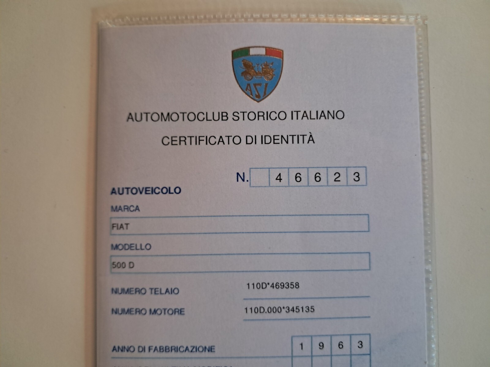 Fiat 500D, 1963 - ASI Gold Plate, approved in Italy - coach doors - convertible top. Fully restored (see photo) Perfect in every detail! The vehicle comes with its original registration document and license plates. It has been completely restored, both mechanically and physically. I attach some photos of the meticulous restoration carried out by the ASI Italia technical commission, using only parts that meet approval specifications. Perfect in every detail! A wicker basket is available as an option in the rear trunk. The color is 115 red, as per ASI approval specifications. Cabriolet model, with a small sunroof or a long canvas top. (Both included) The vehicle comes with an ASI certificate of identity and an ASI gold plate, issued following inspection by the ASI commission in Piacenza (Italy) - see photo. The vehicle was completed in 2017 and obtained Gold Plate certification the same year. Since then, it has been used very little, only for a wedding and a few other occasions. The car has always been garaged and covered with its special car cover.The car is located in Italy, in the province of Florence. Transport is the buyer's responsibility.