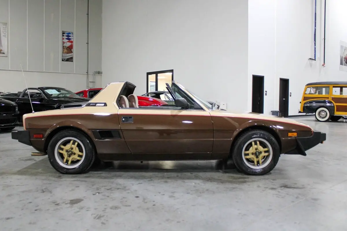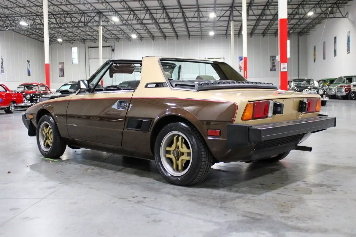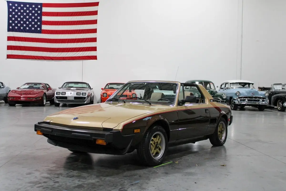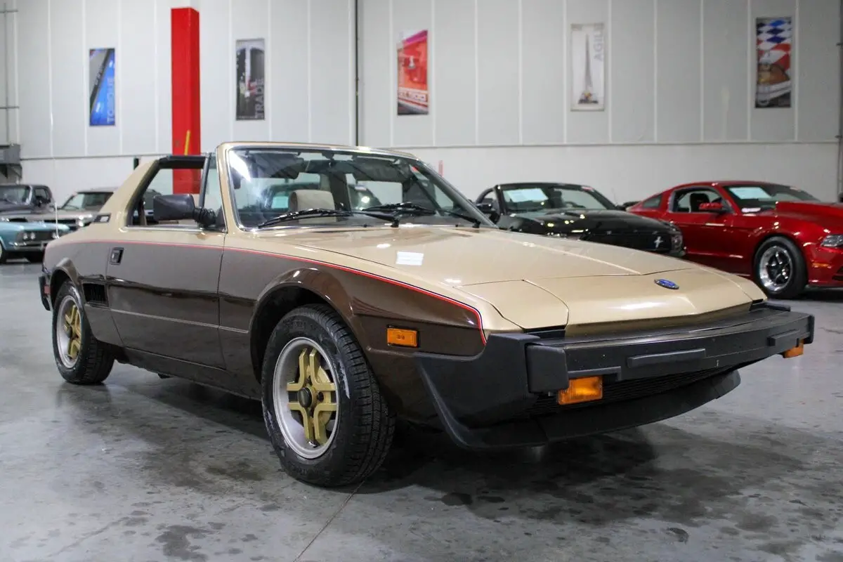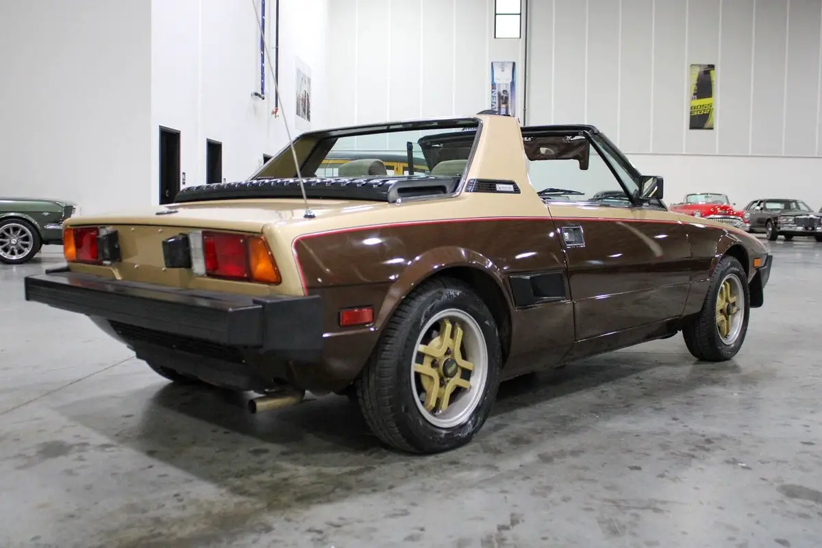 The 1985 Fiat Bertone X1/9 is a striking example of Italian design and engineering, combining sporty performance with a uniquely compact and stylish package. This particular model features the rare Bertone Torino edition, finished in a distinctive two-tone gold over brown metallic paint that beautifully highlights the car's sharp lines and wedge-shaped profile. Complementing the exterior are 13-inch gold wheels that enhance the car's classic 1980s aesthetic. The X1/9's lift-off targa top allows for open-air motoring, offering a driving experience that is both engaging and spirited.