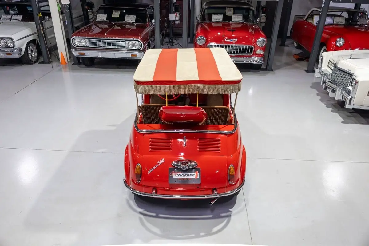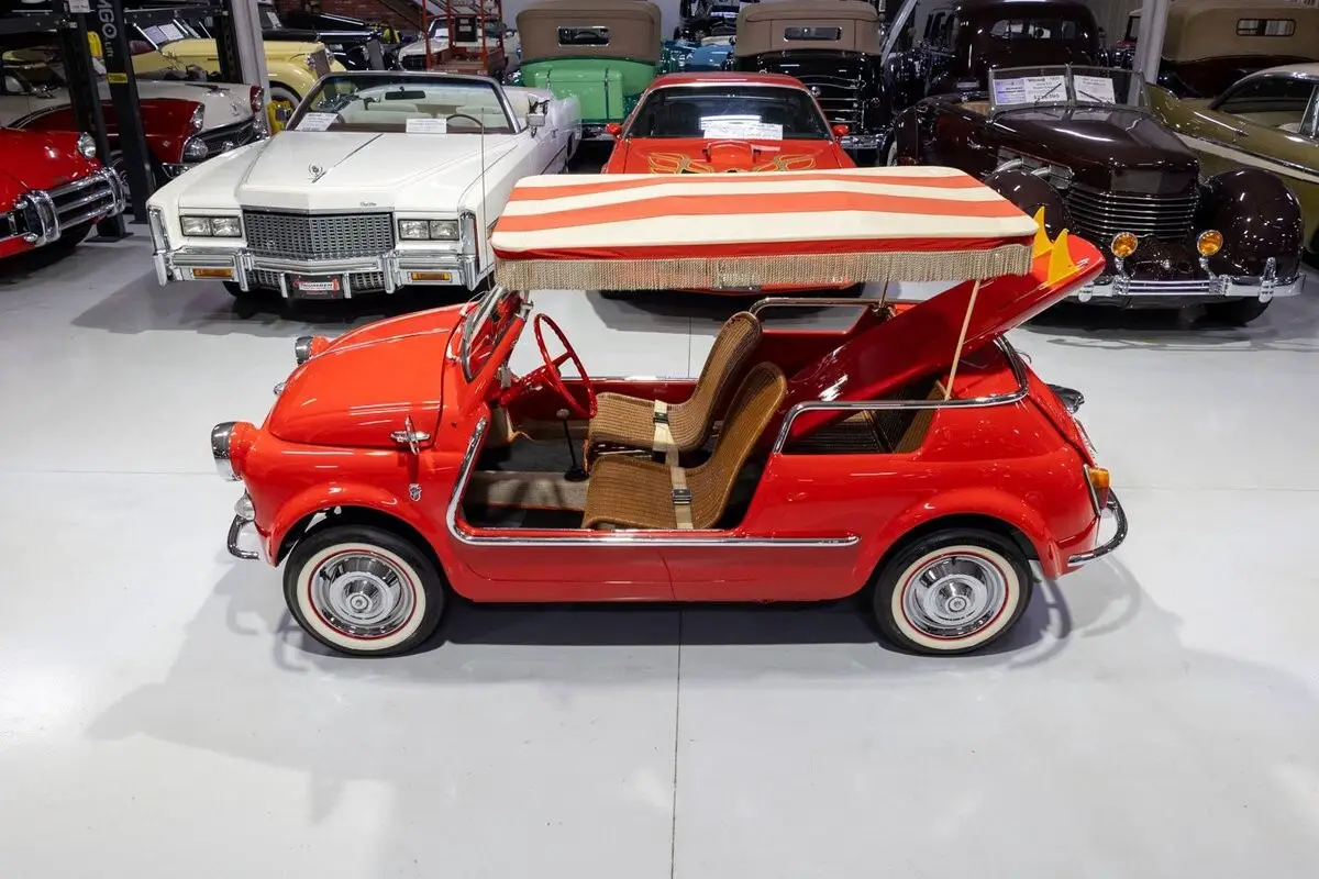 This 1959 Fiat 500 Jolly is an absolutely stunning, Ghia-designed beach buggy that is ready to turn heads! The story behind what is perhaps the most iconic classic Fiats, the Fiat Jolly, requires the examination of the histories behind two of Europes most famous automotive companies, Fiat and Ghia. With history dating back to the late 19th Century, Fiat S.p.A. (then known as Societa Anonimo Fabbrica Italiana di Automobili Torino) was founded by Giovanni Agnelli in 1899. By the 1920s and 30, Fiat garnered a reputation for both its production passenger cars as well as some of its racing cars, sporting a variety of Fiat-built engines ranging from modest 4-cylinders all the way up to sporty supercharged 8-cylinders and beefy V-12s. Following the end of World War II that largely stopped automobile production, and abruptly halting the momentum of the world's growing automotive industry, Fiat emerged as Italy's largest industrial firm. Around the same time, Fiat's reputation became synonymous with small, economy-focused automobiles, something that hasn't really changed for the last 80 years. Founded in Turin in 1916, Carrozzeria Ghia & Gariglio was the brainchild of visionary founders Giacinto Ghia and Giovanni Gariglio. Mr. Ghia started his professional career as an apprentice coach builder when coach builders were building horse carriages. As the motor age began to take hold, Ghia transitioned from an apprentice, to a mechanic, and then to a test driver, where he suffered a significant injury that led to Ghia and Gariglio founding their firm. Initially Ghia was tapped to produce lightweight aluminum bodies for Alfa Romeo's race cars. In 1921, Ghia and Gariglio's company signed a contract to produce some sportier bodies for another Italian firm, Fiat. During World War II, Carrozzeria Ghia's facilities were destroyed and the company was forced to rebuild after the War. It was during this time that Giacinto Ghia unexpectedly fell ill, and passed away, many attributing his illness and demise to the stress from the destruction of his facility. After Ghia's death, the firm changed hands a few times but by the 1950s the company had recovered and reestablished itself as one of the most prominent automobile design firms in Italy and across the world. Automobile manufacturers from around the world, including Germany's Volkswagen, Sweden's Volvo, and even America's Chrysler partnered with Carrozzeria Ghia to design some of the most elegant automobiles ever produced. However, Ghia's relationship with Italy-based Fiat remained in tact, and while Ghia assisted with the design of some of Fiat's more conventional automobiles, it also contributed to perhaps the most novel, most unusual Fiat the Italian firm ever sold, the Fiat Jolly. Reportedly, Fiat boss Gianni Agnelli commissioned the Ghia built Fiat as a sporty and chic "beach buggy" that was small and light enough to fit onto the stern of his yacht Agneta and could ferry him and his guests to and from the beach. Known for their wicker basket-weave seats, door-less fully open sides, and cute fringed Surrey tops, the Jolly became a status symbol among the World's elites, such as President Lyndon B. Johnson and Aristotle Onassis. The bespoke Fiat Jolly is known for its very low production, with estimates of less than 450 produced during its 3 year production run. Additionally, due to their use in and near humid, saltwater environments, their survival rate was quite low with some estimating only about 100 remain in existence today. Powering this particular '59 Fiat Jolly is a rear-mounted Air-Cooled 479cc Two-Cylinder engine fed by a single barrel Weber carburetor that together were said to have created 21 horsepower when new. The 479CC air cooled engine is mated to a 4 speed manual transmission that sends power to the rear wheel and makes this little Fiat a really fun car to take for a drive. A 12 volt electrical system provides improved startup abilities and makes the exterior lighting more reliable. Riding on a set of wide whitewall tires accented with chrome wheel covers, this 1959 Fiat has a truly upscale 50s look, whether you're cruising to the beach or parked at the local car show. The front trunk is well-detailed as well, housing the fuel tank and even a spare tire. This '59 Jolly is topped with a Red and Eggshell striped Surrey top accented with fringes around the border that gives this little yacht buggy the feel and look of the ultimate beach car. The chrome trim and brightwork around the exterior of this Fiat Jolly shows particularly well and further elevates the car from nearly every angle. A driver's side chrome mirror is also a welcome addition since it makes an already easy car to park, even easier. The Ghia-designed body on this Jolly is in wonderful condition as it has been repainted in an eye-popping Coral Red paint that completes the gorgeous exterior appearance of this adorable 50s microcar. The interior of this 1959 Fiat 500 Jolly is absolutely incredible! The front and rear wicker-wrapped seats are in fantastic condition and are sure to fend off damage from any wet swimsuits or sand remnants left behind from a beach excursion. The floor is covered with tan carpeting along with Fiat-branded protective floor mats that not only look great but also add to the beach buggy look. While a bit scarce in terms of amentities, the red painted dash and red steering wheel are in excellent condition on this bespoke automobile. The dash is equipped with a 70 MPH speedometer with integrated indicator lights for lights, dynamo operation, fuel, and oil pressure, a chrome center-dash mounted rearview mirror, AM radio, and wicker wrapped grab bar. Whether you're looking to have the cutest car at your next beach excursion or you're adding to your collection of high-end classic cars, this 1959 Fiat 500 Jolly would make an excellent choice. Give Ellingson's a call today at 763-428-7337!