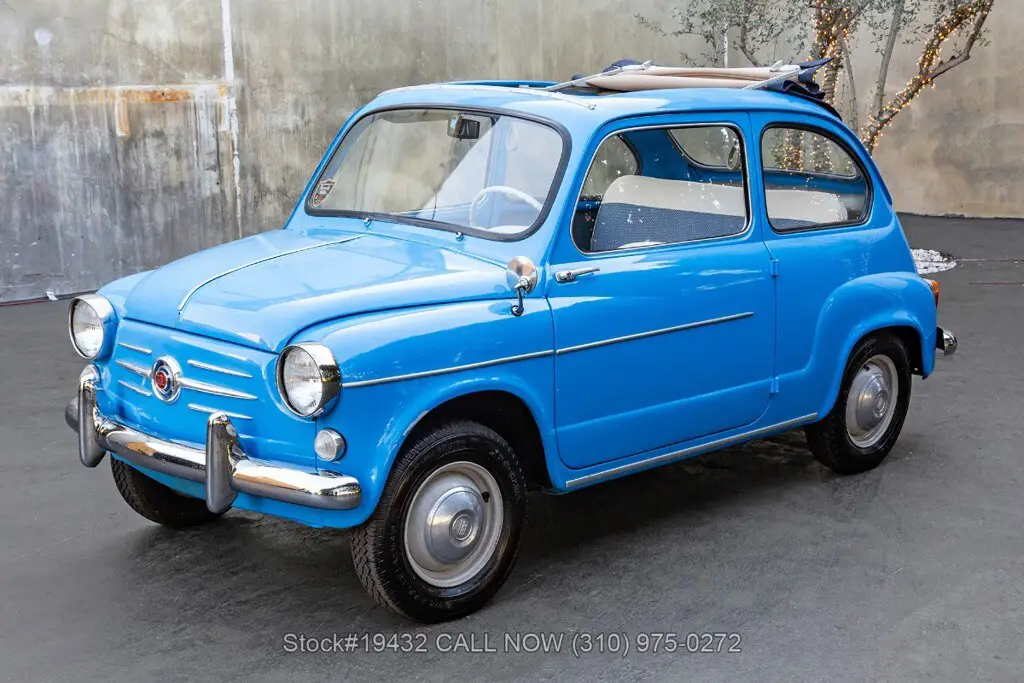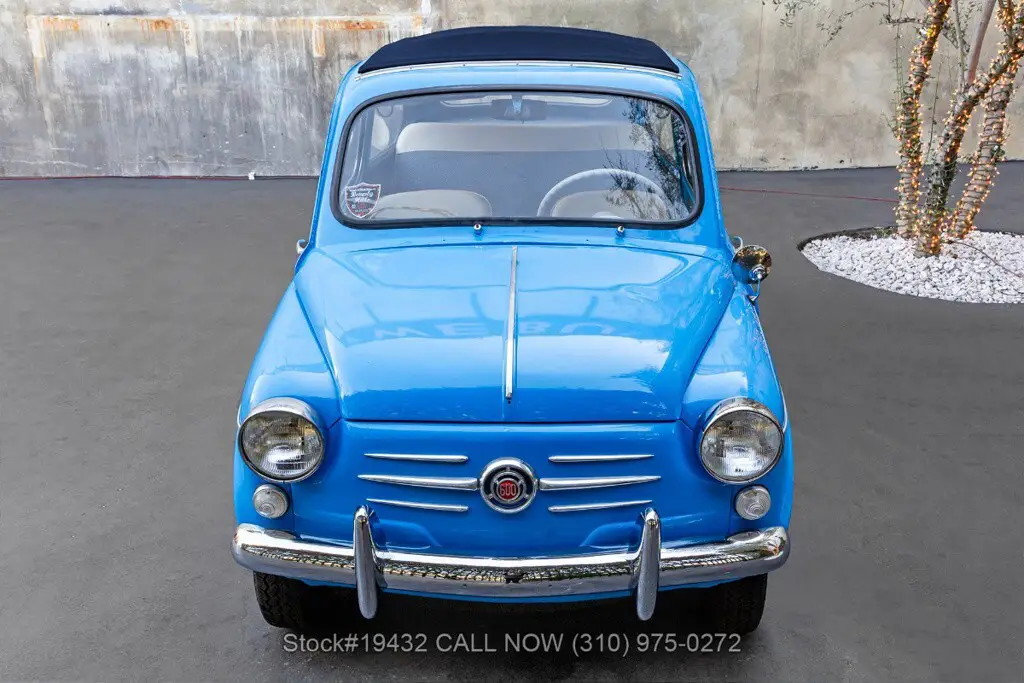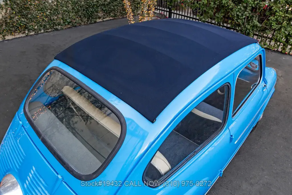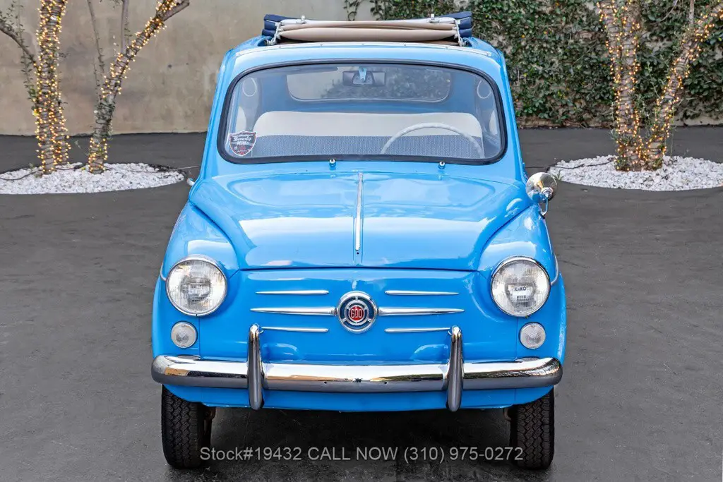 1958 Fiat 600 Transformable Introducing this 1958 Fiat 600 Transformable, finished in a cheerful Sky Blue that perfectly suits the car's upbeat personality. The cabin continues the period-correct charm with a tasteful two-tone interior, featuring blue textured cloth seat inserts paired with off-white (cream) vinyl bolsters and matching piping. Highlights: - California Car - Sky Blue Exterior Color - 4-Cylinder Engine - Weber Single-Barrel Carburetor - Full-Length Folding Dark Blue Webasto Canvas Roof - "Suicide Doors" (Hinged at the Rear) - Chrome Bumpers - Veglia Instrumentation - 12-Inch Steel Wheels Power comes from a compact 4-cyl