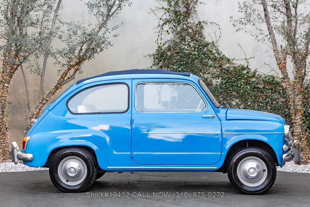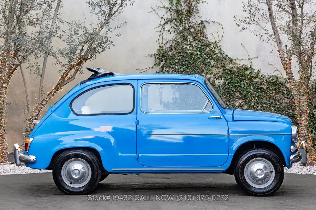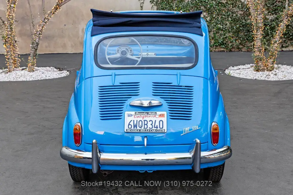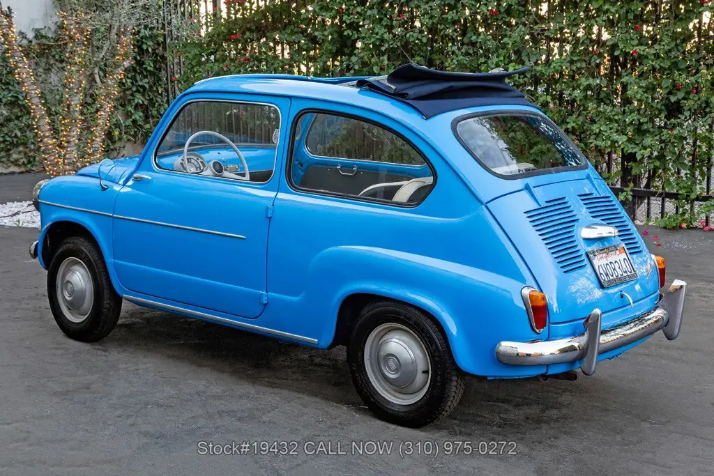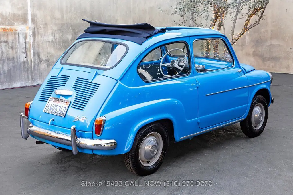 1958 Fiat 600 Transformable Introducing this 1958 Fiat 600 Transformable, finished in a cheerful Sky Blue that perfectly suits the car's upbeat personality. The cabin continues the period-correct charm with a tasteful two-tone interior, featuring blue textured cloth seat inserts paired with off-white (cream) vinyl bolsters and matching piping. Highlights: - California Car - Sky Blue Exterior Color - 4-Cylinder Engine - Weber Single-Barrel Carburetor - Full-Length Folding Dark Blue Webasto Canvas Roof - "Suicide Doors" (Hinged at the Rear) - Chrome Bumpers - Veglia Instrumentation - 12-Inch Steel Wheels Power comes from a compact 4-cyl