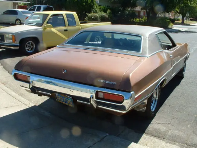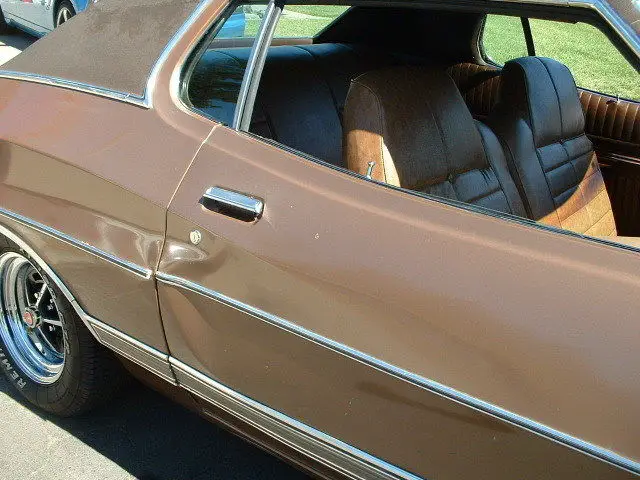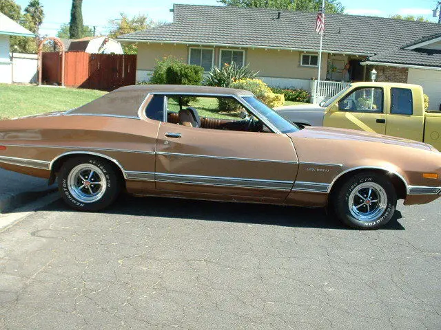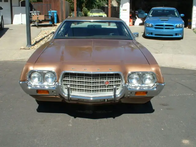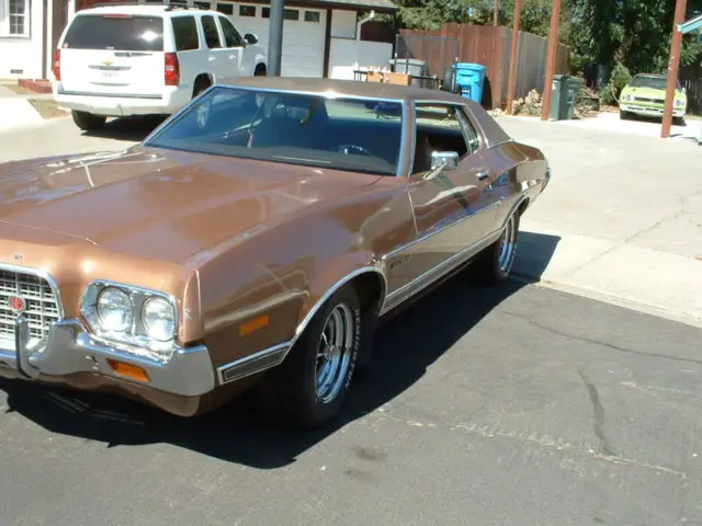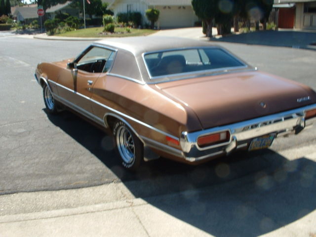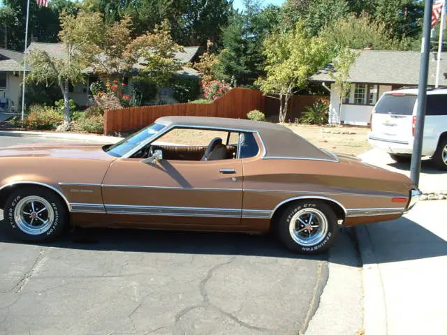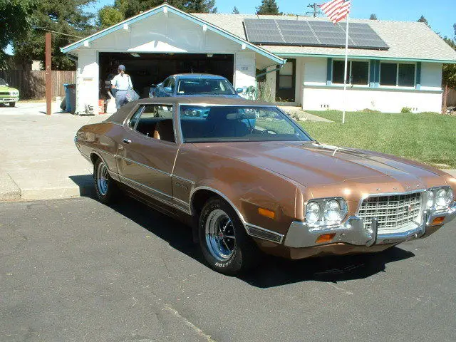 HISTORY - bought new in Sacramento CA, lived in Chico CA up till 2011 when the elderly couple passed, the car was willed to the grand son in Dixon CA where i bought it a 2 years ago. the car is the best runnig old car i have ever owned. the car was always maintained thru the Ford dealer in Chico but unfortunately alot of the records were lost in the estate. the car has 75,200 actual miles. over the last 2 years i put wheels and tires on it, reupholstered the front and back seats to original OEM factory Torino specs, the carpet and headliner are very good. this car has never been detailed and you can tell by the engine compartment how well it was taken care of. the car has 1 dent in the passenger side door, 1 very small dent on the front passenger side fender extension, and 1 crack in dashboard about 4 to 5 inches, and the car will need a new vinyl top in the next couple years. this car is solid and like i said it is an awsome running car, starts right up, drives excellent and stops great, it shifts great and still has a lot of get up and go, steering is tight, it does not smoke or burn oil. i did a compression check and all cylinders are within 10 pounds. it is missing the Torino logo emblem on the deck lid and the factory radio antenna. the gas gauge does not work and the A/C needs to be recharged. the dual exhaust has about 4 years on it and sounds very healthy but not load, all the chrome and trim is flawless except the after market piece of trim to pertect the car from parking lot dings where the dent is on the door. the trunk and floor pans are solid also. i had an estimate done and a new vinyl top and fixing the dent could cost about $1500 at the most. if you have any questions contact me with your phone number and ill call you. if i did the top and the dent i would ask another $2,000 PS i also have a perfect GT hood. if you want the hood loose keeping the original hood on the car it will be $500 extra and you will have to work that out with your shipper. if you want me to exchange the hoods it will cost an extra $650, if you want the hood painted it will cost a total of 1,150.00 extra. thank you for looking