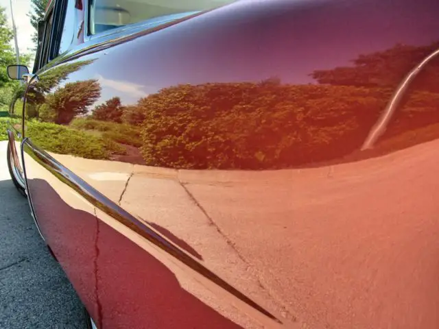 The body is super clean, straight, and rust-free, as is the frame. Paint is a gorgeous rose metallic that is even more stunning in direct sunlight. The windows are trimmed in black with subtle metallic in it as well. Paint is sanded and polished to a deep, reflective luster and is in excellent condition.