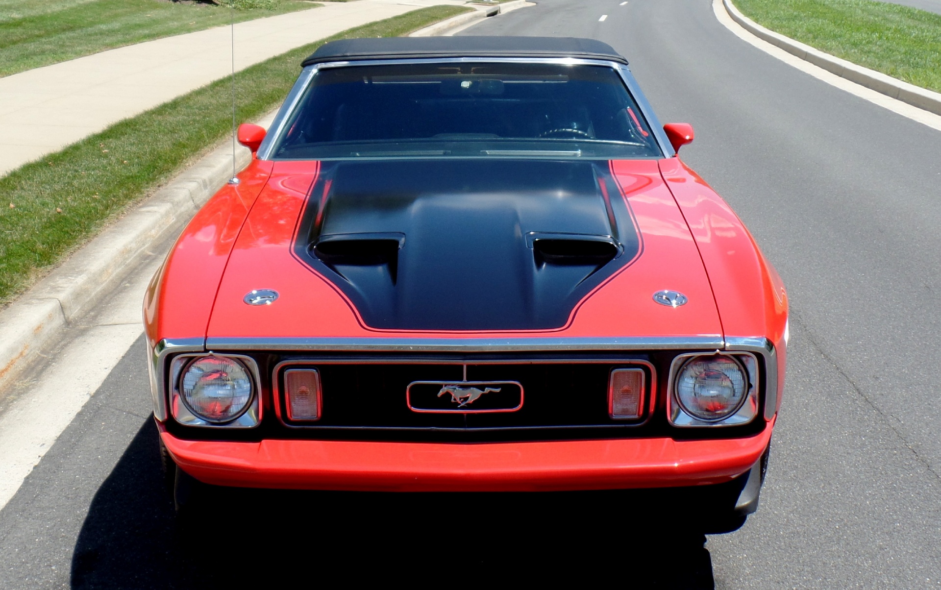 '73 Mustang Mach 1 Convertible, Recent rotisserie restoration! The bottom is just as beautiful as the top (look under this car!) Rebuilt 351cid HI-PO V-8 with dual quads (2X4bbl carburetors) cobra engine dress up pkg, est@400hp! Rebuilt Heavy duty C4 automatic trans, Original factory HD Ford 9" rear differential, Mirror finish factory Bright red paint black stripes-black hood treatment & callouts, Black bucket seat interior w/factory console, Power black convertible top w/ matching boot, Full factory gauges incl. 120mph Speedo & clock, Optional Factory power disc brakes, Optional fast ratio power steering, Correct 15" Magnum 500's w/Goodyear Eagles, Front chin spoiler & rear wing, Great sounding dual exhaust, All new chrome & polished stainless trim, Last year for the V-8 Mach 1, Professionally reproduced and restored, this car looks, performs, runs and sounds waaaay better than stock with about a dozen trophies in the trunk to prove it! Show or drive this reliable, show winning, iconic, classic Mustang.