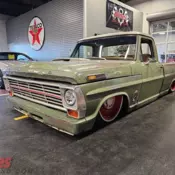 The sub-frame is from a modern Ford Crown Victoria. These are commonly swapped under older vehicles because they are easy to find, service and source parts for. The truck has air bags at all four corners complimented with shocks. It can cruise along with a normal (street-able) ride height and then go and lay frame all the while maintaining a comfortable ride. The wheels are steel with new tires.