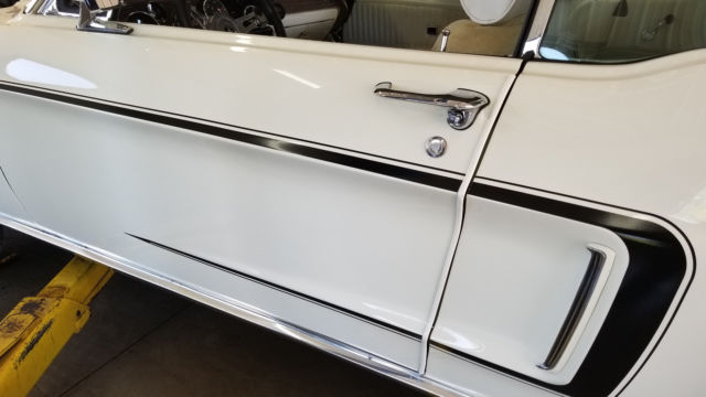1968 Wimbledon white mustang with black C-stripe, paint is almost flawless, chrome almost flawless, some minor door dings, no rust on body or undercarriage, very minor surface rust from driving on suspension parts