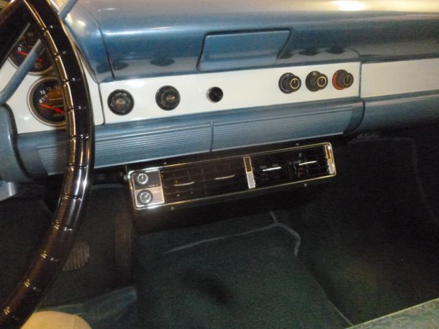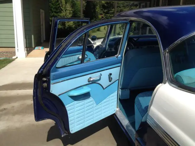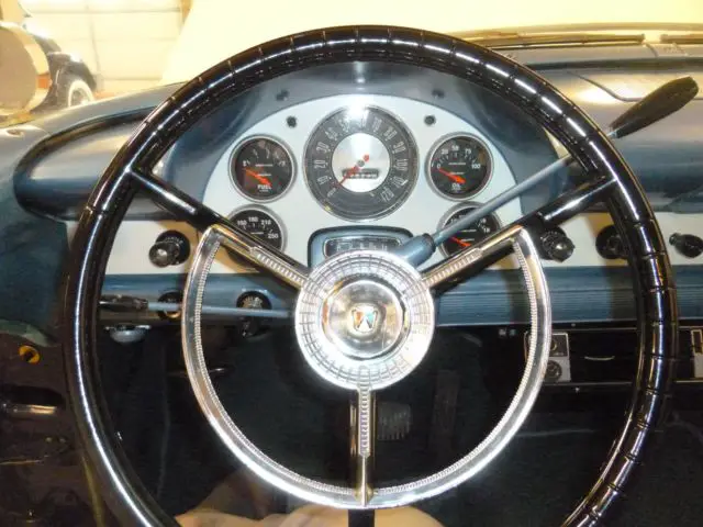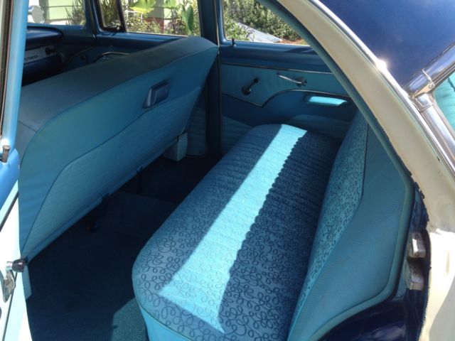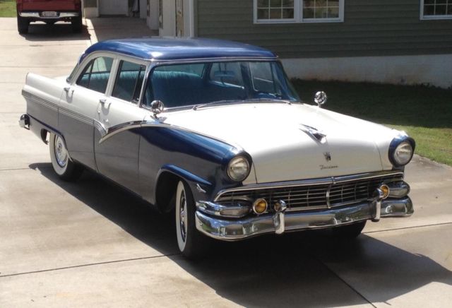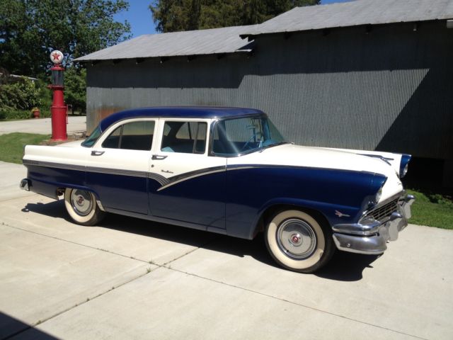 1956 FORD TOWN SEDAN. car was originally all blue, but in 1956 dealer could not sell car from lot, until he painted the white 2-tone paint scheme, car was then sold. always stored inside by first two owners. third owner was a large collector who had this car about 30 years, and leased them out to movie and tv productions car was used in several movies.The original 292 motor was removed and rebuilt by local hot rod shop, bored out 30 over and stainless steel valve seats installed for unleaded gas, new valves and pistons, crank ground and new bearings, old t-pot carb removed and replaced with a rebuilt 1957 type holley and 57 intake. new msd distributor and t-bird valve covers. Master cylinder replaced with modern two chamber type, and new Borgson power steering box added. new 15" t-bird steering wheel replaces the old large diameter wheel, most all of the wiring was replaced and a modern fuse block added, Battery moved to trunk. Original hot water heater removed and replaced with a vintage air heater, also vintage air a/c added under dash. second radio delete plate used to hide old heater control holes in dash. new "motor meter" gauges added for (gas-water-oil-volts) to replace warning lights on dash. original speedometer used. seats and door panels are original. New (unpainted) fender skirts and original owners manual included.