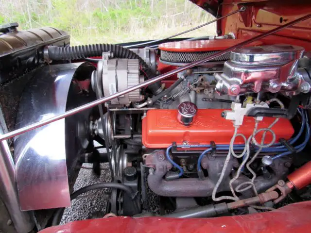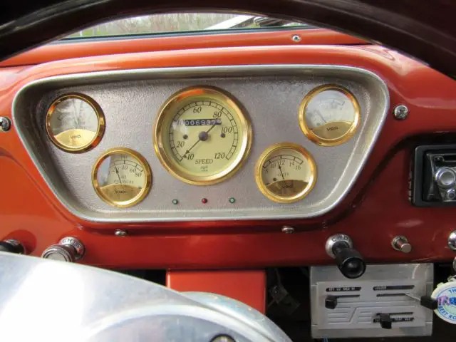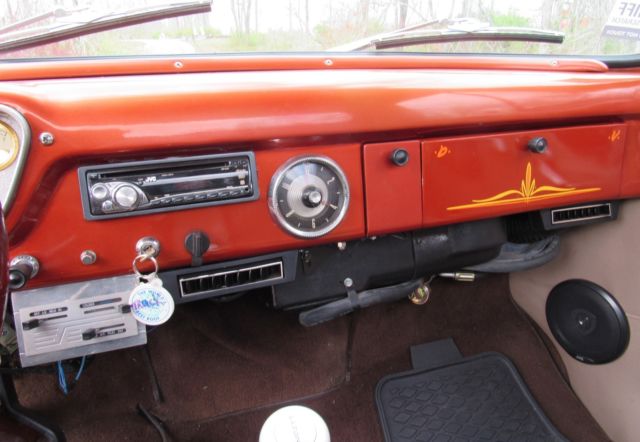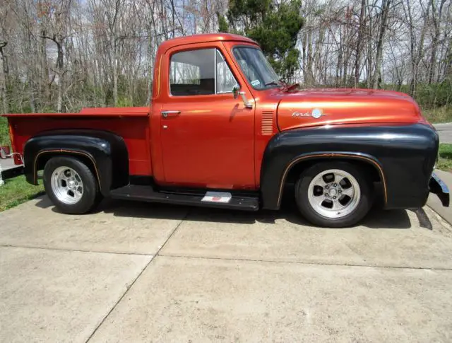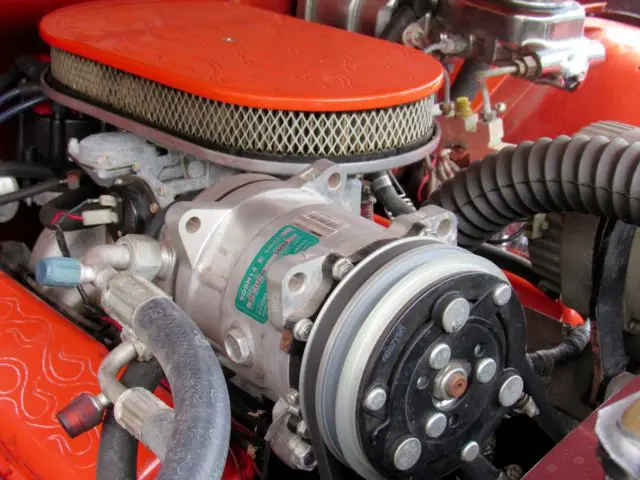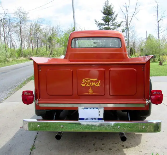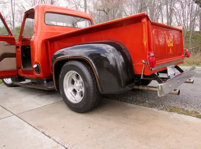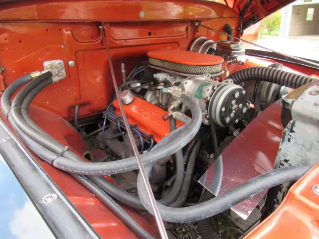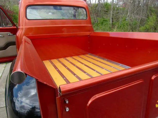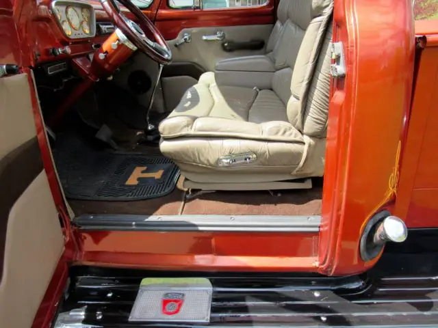 Sunset Orange Exterior with black fenders and running board.Tan Leather Interior with brown design in door. Features include Power Steering,Front Disc Brakes, JVC, mp3, KDS 25, HD and SAT ready, cd player, AM-FM Radio, air conditioning, tilt steering wheel, electric bench seat and American Racing Mag Wheels with Black Wall Radials. Battery is in floorboard.The bed of the truck is oak, wood slatted.Custom pin striping done by Howard Horn.