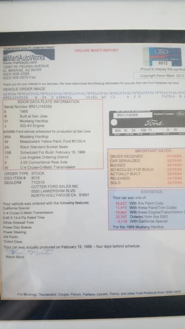 This Mustang GT CS has all the specific California Special parts such as the fiberglass trunk and in caps the side scoops the Lucas fog lights with covers and the hood pins that are specific to the California SpecialI also have the Marti report