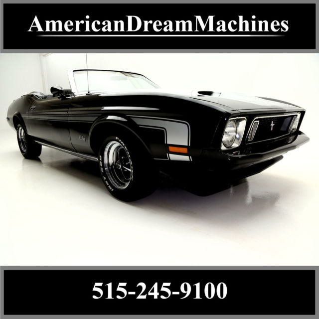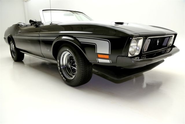 Raretriple black "Q" code 351 Cobra Jet1973 Mustang convertible equipped with a 4 speed, disc brakes, tach and gauges.Extremely solid body withgreat lines and gaps.The black paint is smooth and accented with silver side stripes and hood treatment. Rear deck spoiler for a muscular appearance. The convertible top is in great shape with a glass back window.Under the hood ishighly detailed and houses the non numbers matching 351C 4 bbl. engine that runs as good as it looks. Power front disc brakes and power steering makes this pony a blast to drive. Performance minded 4 speed manual transmission with Hurst Shifter.Black knitted vinyl bucket seats and console. Rare factory tach, gauges and clock. Pioneer sound system supplies the tunes. Super clean and solid undercarriage. New 15" chrome magnum wheels with Firestone white letter tires.