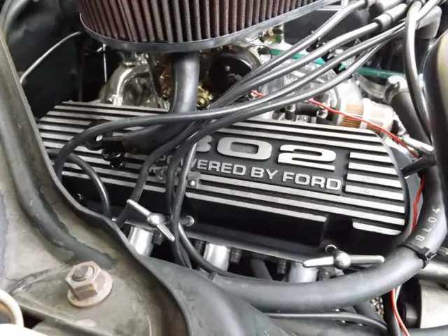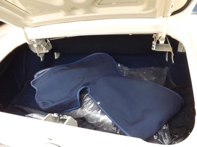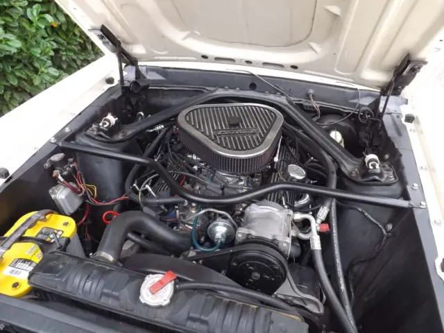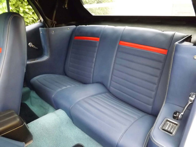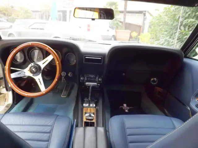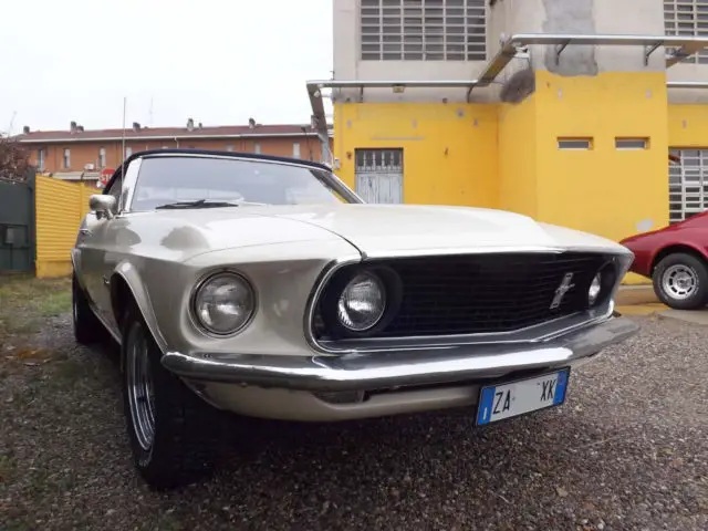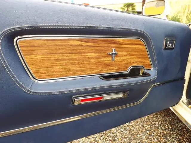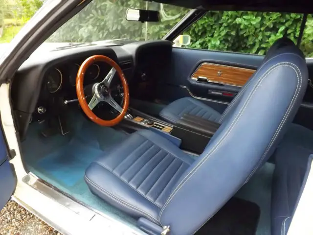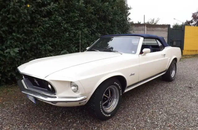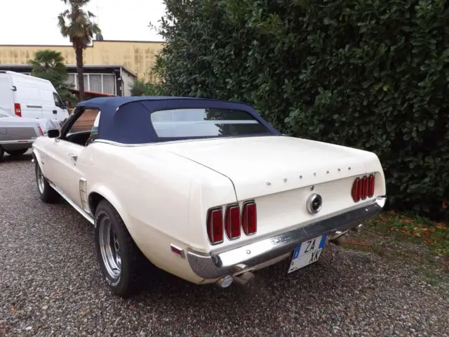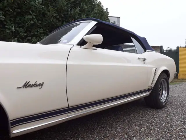 1969 Ford Mustang Convertible, professional restoration, all is in new condition: paint, chrome, interior, engine... White paint with blue side stripes (GT style), blue canvas ragtop with cover. Blue leather interior. Original V8 engine 302 cid completely rebuilt with Ford Performance parts and Edelbrock. Ford-O-Matic automatic transmission. Autoradio vintage Mustang style with cd, parrot/bluetooth/usb. Air conditioning. Staggered Magnum wheels.