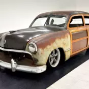 At first glance, this handsome pickup has just the right vintage look to be charming. You don't expect it to be fast, not with looks like that, but it will bring a smile to everyone's face when they see it ambling down the road. The freshened Ford face would become one of the most popular vehicles in history, and despite thousands of dollars' worth of work, this one retains its commercial good looks with modest trim and gorgeous bright blue paint. It's quite straight, suggesting that this one was tasked with light-duty work all its life, and when it was freshened someone took their time to get it right, because this sucker is awfully nice. The fat fenders look awesome crouching over the modern rolling stock, the original hood and doors fit quite nicely, and the bed has been filled with wood planks that lend it a rustic feel. There's a custom rear roll pan with four taillights out back, so it's easy to spot on the roll, but the rest is quite traditional.