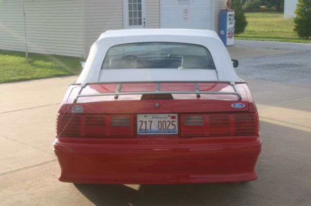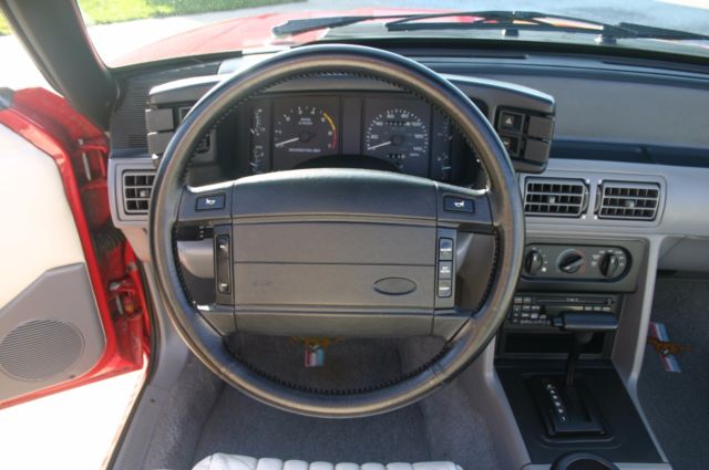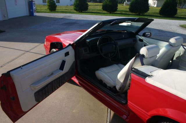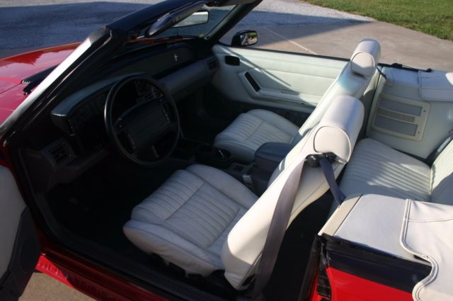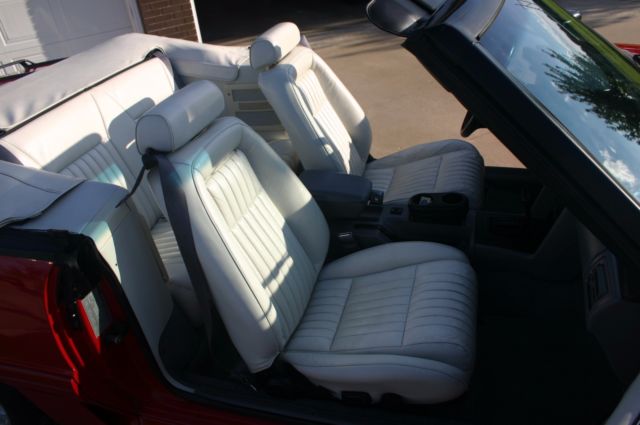 This Mustang was purchased locally by an older lady who drove it and garaged it for years, then it went to her son, a Doctor in the area.It was then sold to a local lady in January of 2003 with about 81,000 miles on it.It was mostly covered and kept in the garage by her as it now has ONLY 82,731 miles on it.ORIGINAL MILES!It is loaded with ALL the power equipment and is a beautiful color combination…Bright Red with White Leather interior.The interior and all interior parts are in Excellent Condition.Everything is there and everything works.I have the original window sticker and the car does have the original white Convertible Boot cover.