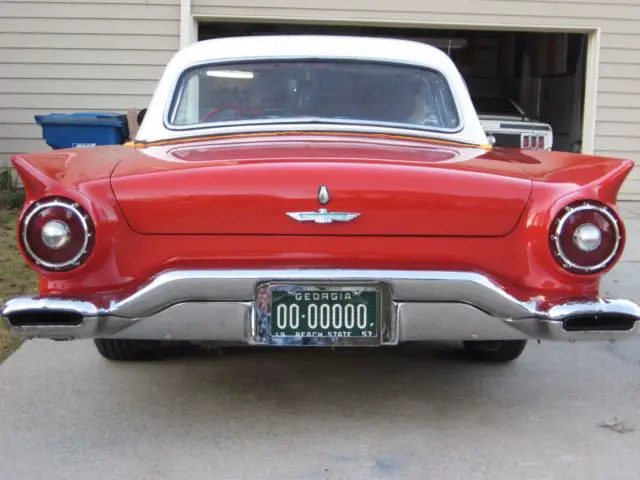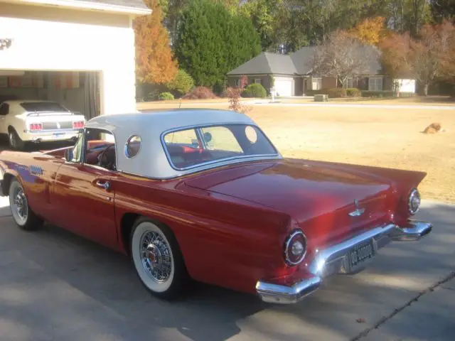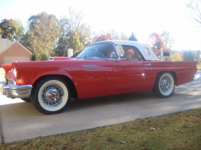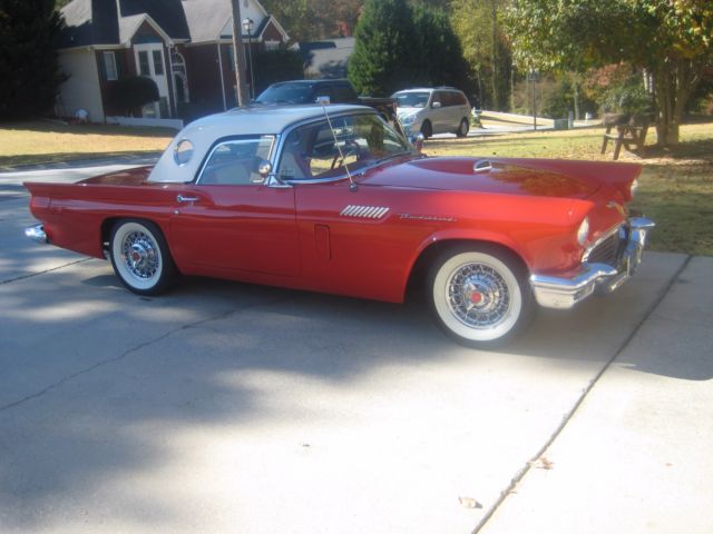!957 Thunderbird torch red with white top and red and white interior. Both tops(convertible top is white). Power steering, power brakes, power windows, power seats, telescopic steering column, and air conditioning. Ford-a-matic transmission with 312 engine with dress-up kit. Kelsey hayes wire spoke wheels, with radial tires, fender skirts come with car. Storage cart for removable top with cover. All original sheet metal un-cut and no rust. Car was restored in 2010, and has many trophies from local car shows. You will not be disappointed with this car. Small chip of paint on hood(see picture) Car is for sale locally, so I reserve the right to end this listing at any time. Car is sold as is where is. $1,000.00 deposit in pay pal within 48 hours of bid close, with remainder within 76 hours, cash or bank transfer. For additional information or questions call Tom at 404-889-5863..