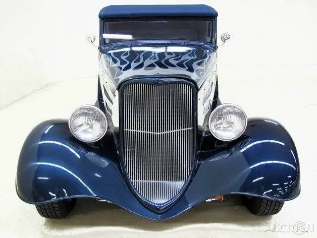 STK 2077 1933 Ford Victoria Remember the best ZZ Top video ever? Right - Gimme All Your Lovin'. Those boys from Texas have a simple formula - great music, pretty women and fast cars. Their favorite, a 1933 Ford Coupe dubbed The Eliminator' and built by Don Thelen. We do not know who built this beautiful '33 Vicky sedan, but we believe it was done in Texas in 2002. The Downs performance fiberglass body (with magnetic doors) is a quality piece. Dark blue metallic basecoat/clearcoat paint with silver flames and pin-stripping gives this classic Ford a menacing look. A beautiful custom upholstered Carson top really compliments the Vicky body style. The hi-grade white vinyl interior incorporates distinctive accents, comfortable Mustang bucket seats and a custom tilt-wheel column to enhance the driving experience. Gauges are digital and laid out nicely. A Pioneer AM/FM/CD provides the tunes. Add power tinted windows and cool A/C - you are ready to cruise in comfort. Horsepower comes from a serious big-block. The 454 was punched .030 for a yield of 468ci, has all the right stuff and is very streetable. Behind this Big Rat is the time-honored GM Turbo400 transmission. The detailed chassis integrates power-assisted rack and pinion steering and a sophisticated 4-link rear suspension with coil-over shocks. Power front/rear disc brakes slow down wide 15 Weld Wheels/tires. This handsome street rod must really be seen to be appreciated. It will soon make one new owner very proud. Call 800-650-1055 or visit www.autobarnclassiccars.com for additional information. ALL VEHICLES SOLD AS IS.