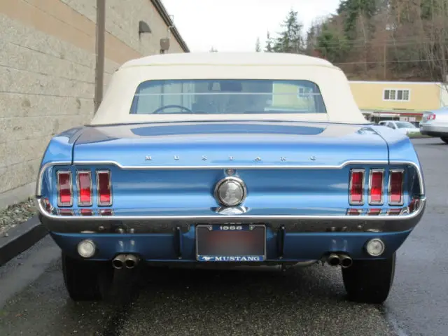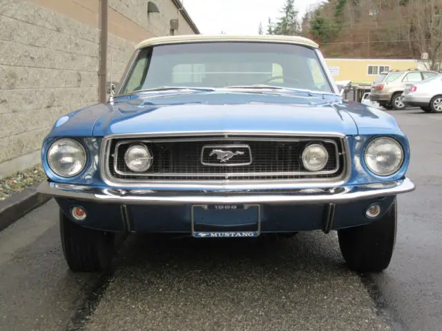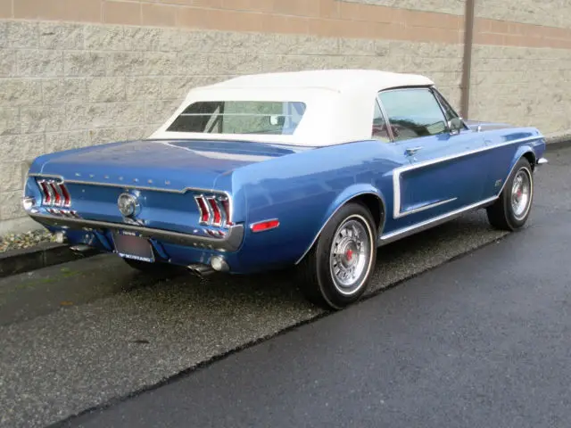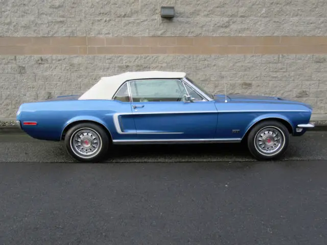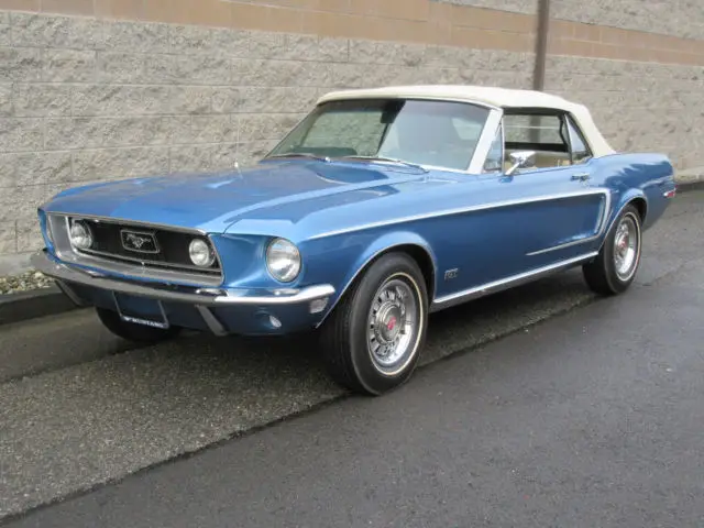 Description: 1968 Ford Mustang GT Convertible 1Beyond Rare - 1 of 43 paint/trim code Very nice restoration - has had a nut & bolt restoration, one of the best in the world 1 of 493 with this motor/transmission code 390 c.i. 4v, 4-speed Factory air conditioning, original center console 9-inch Ford 3.00 limited slip axle, tilt away steering wheel AM-FM stereo, AC (Selectaire), tinted glass, beautiful Acapulco blue White power top, parchment décor buckets, P.S., P.D.B. This car is better than new, documented by Marti report V.I.N. 8F03S201509 102,807 miles $64,950 For more info please call 425-343-7079 or 206-683-5855