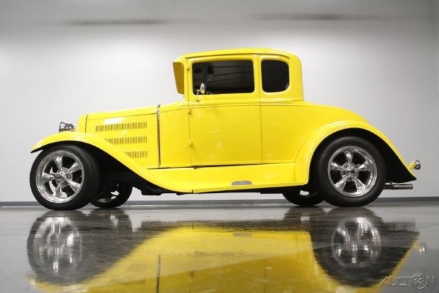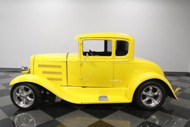Bright, custom, and amazing from every angle - this 1930 Ford Model A takes an iconic 5-window shape forged in steel, and gives it a fuel-injected motor, upgraded suspension, comfortable A/C interior, and a bold yellow finish. It's the kind of total package that impresses wherever it goes. From the first moment you lay eyes on this one, you know they got the stance to look just right. This Ford keeps the correct amount of original Model A appearance with its upright cab and cowl treatment. But then the full package is covered in a high gloss yellow that has a fantastic shine in the sunlight. In fact, the paint has such a luster that it takes the place where some other custom builds reserve for bright work. The result is a true standout appearance. But it wouldn't be a true custom without some chrome, so now it's used to highlight special features like the waterfall grille, bright headlamp housings, step plates, dual exhaust tips, and iconic torque thrust-style wheels. Inside, the exterior yellow returns to highlight the color of the iconic Model A dash. That's joined by a quality two-tone gray interior. The seat offers individual inserts and bolstering for the driver and passenger, and the side panels match this pattern for a true uniform feeling. There's plenty of great features like power windows, power locks, remote door poppers, power radio antenna, and an AM/FM/CD stereo in the overhead console. There's even modern R134a air conditioning in this retro ride. The driver gets a grippy Lecarra steering wheel, and beyond that is a full set of classic-style VDO gauges to keep you fully informed on what's going on in the engine bay. When you lift the hood, you can instantly tell this is a far more modern motor than what you see in most hot rods. It's a 4.3-liter fuel-injected V6. Built to give power to Chevy's trucks, it has plenty of horsepower and torque to really move this coupe with authority. The sound from the dual exhaust backs up this feeling. Performance goes beyond just the motor. Up front there is an upgrade to a Mustang II-style independent suspension with tubular arms, and there are strong ladder bars in the rear. These are backed by adjustable coil overs and disc brakes at each wheel. Because you'll want to show this one off near or far, there are more great anytime driving features like power steering and a four-speed automatic transmission w/overdrive. A steel-bodied custom coupe with all the best features to enjoy everywhere from the local car show to the Power Tour. This is a dream car for a lot of us, but there's only one up for grabs. So if you want this in your driveway, you need to hurry and call today!