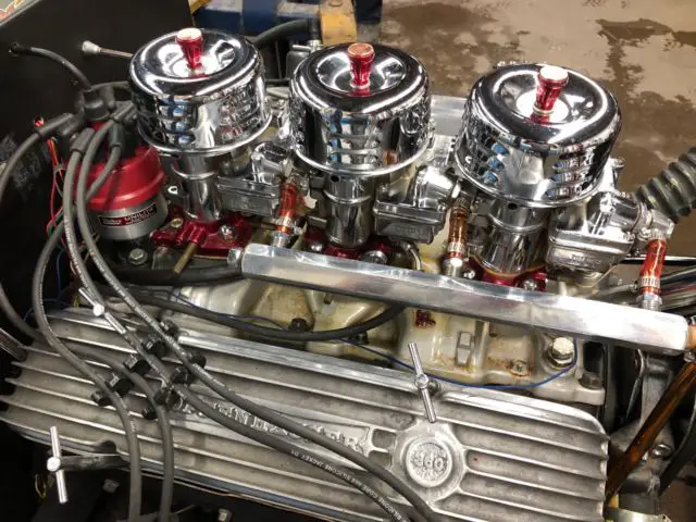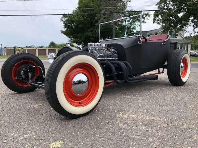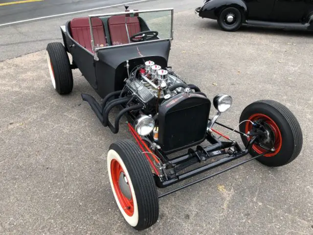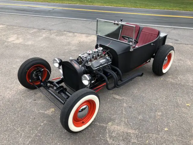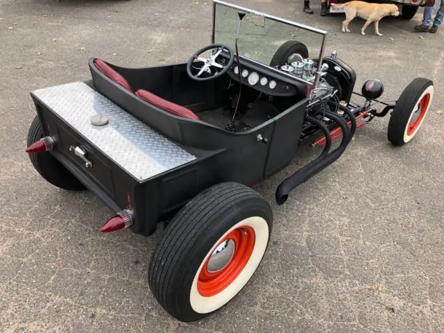 1923 Ford T Bucket Roadster Hot Rod. Excellent quality fiberglass tub made by Total Performance of Wallingford, CT. The motor is a Chevy 350 V8 with triple carburetor's and open header exhaust. Turbo 350 Transmission. Ford 8" open rear end. Electric Fan. Dash gauges by Classic Instruments. Beautiful old school pin-striping everywhere, radiator tank, headlight buckets, rear end cover, etc. The interior is very basic, seats are red leather with matching door panels, old school steering wheel, and 'ape' style automatic shifter.