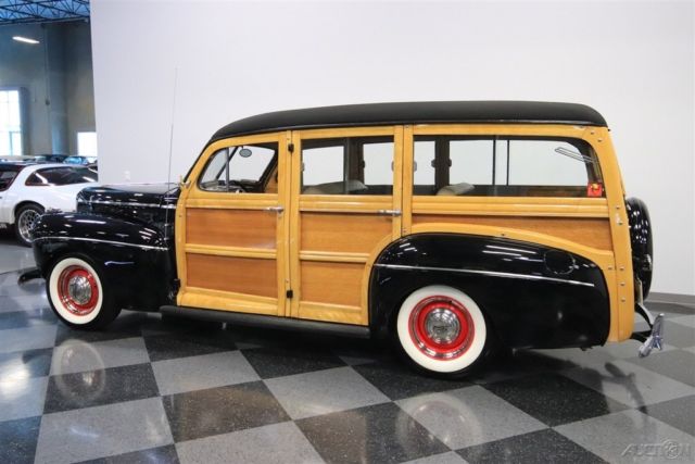Here's a cool restomod classic that mixes rarity and originality with some great upgrades. This 1941 Ford Super Deluxe Woody Wagon is a true head-turner at any car show. Plus, with a fuel-injected Corvette V8, enhanced front end, and custom interior, it has a great driveability that will make you want to cruise all day long. It's had to tell this is a serious street machine from the first glance. That's because it just looks like a terrifically restored woody wagon. With less than 10k miles on it since completion, the black paint looks slick and shiny. It's the perfect color to distinguish the rounded metal and drawing even more attention to the real wood. And the lumber really is terrific. You'll spend plenty of time looking at all the finely crafted wood joints that come together to make an upright classic body. You also get to see up-close the adaptations made to fit the metal elements. The magic is really in the curves over the A-pillars and rear fenders. You'll marvel at where the front doors have a craftsman lower panel to meet the fenders. Plus, the two-piece wheels, rear-mounted full-sized spare, and canvas-covered roof all add to this classic package. This wagon is a from an era when craftsman could still make your car body, and this one is preserved like the national treasure it is. In true old-school woody fashion, the interior feels like a lumberyard. Beautiful wood covers the doors, all the side panels, pillars, and headliner. Matching this same tone of the timber nicely are two rows of leather and tweed seats. The rear hatch opens out so you can have your surfboard sticking out the back while cranking the beach boys on the AM/FM/CD stereo (ok, if you're a little more modern, you can plug in your iPod, too.) When you slip into the driver's seat, you start to really understand how custom this car is. The steering wheel looks like a classic unit, but it's actually a smaller diameter Lacarra upgrade. And while the dash has a vintage-style wood tone it also houses everything from a digital gauge package to provisions for air conditioning. One look at the engine bay, and you instantly know how modern this woody wagon is. So you'll love lifting the hood at car shows and seeing the faces of everyone who instantly recognize fuel-injected LT1 power. This was a true powerhouse when it debuted in the Corvette, and today its 300 horsepower is a serious upgrade to this classic Ford. And to make sure this updated vintage wagon handles better than a '40s machine, it has also been upgraded to a Mustang II-style independent front suspension. Plus, power steering, front disc brakes, and the C4's four-speed automatic transmission with overdrive means you'll happily cruise this woody near or far. This is an exceptionally cool cruiser that's perfect for everything from a surf wagon, to the classic that fits the whole family, to a show stopper at the events. You already know how rare this is, so hurry up and call today before this opportunity is gone!