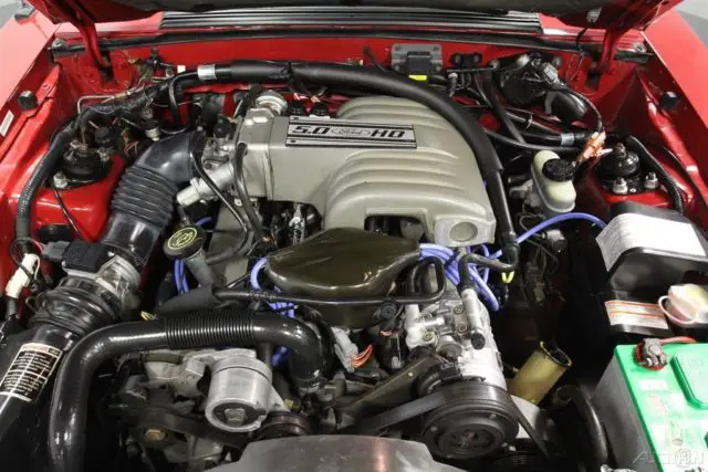 Powerful, affordable, and an unbeatable color combination - this 1991 Ford Mustang LX is a terrific cruiser with its legendary 5.0 V8. And its well-preserved appearance inside and out, this one is absolutely irresistible. Wild Strawberry Metallic is the perfect bold and bright color for a sunshine-friendly drop top. This is even the original application to the car! When you see the kind of luster and shine it produces, you instantly know this Mustang has been treated with care for nearly three decades. This car really has a great dual personality. The black convertible top coordinates with the optional luggage rack, cowl vent, and the rubber strip that surrounds the whole body to create a sporty two-tone nature against the red. But then all you have to do is take the top down, and a whole new personality is shown. The interior really makes an impact because it's so well presented. The white convertible boot and plenty of red interior elements create a well-coordinated presentation inside and out. This convertible has averaged less than 1,800 miles annually over its lifetime, and so they took exceptional care of this loaded interior. The luxury LX starts with those leather bucket seats. Low mileage means little seat time, and the way these present today tells you this was never left out outside with the top down for any extended periods. There are plenty more great features, including power locks, cruise control, power mirrors, driver's airbag, and the original AM/FM/cassette stereo. Because the air conditioning is blowing cold with modern R134a, you can comfortably enjoy top down motoring long into the summer season. Speaking of open top fun, you have power windows and a power convertible top. So you never have to leave the driver's seat to go from enclosed comfort to a wind-in-you-hair experience. The 5.0-liter fuel-injected V8 under the hood is the reason the Mustang was the pony car of choice for an entire generation. Great sound, stout construction, and impressive torque keeps this a favorite today. While there's a huge aftermarket for affordable performance upgrades, you can tell there has been a lot of care to keep this original motor looking bone stock. That's why people will marvel at the fresh presentation that looks so correct, right down to the factory decals. More than just look good, this drop top Mustang was built to be a true cruiser. That's why you have power steering, front disc brakes, ABS, grippy modern tires, and a four-speed automatic transmission w/highway-friendly overdrive. Complete with owner's manual and the original warranty card, it's going to hard to find something that does a better job of mixing power, preservation, and desire... especially at this price. Call now!