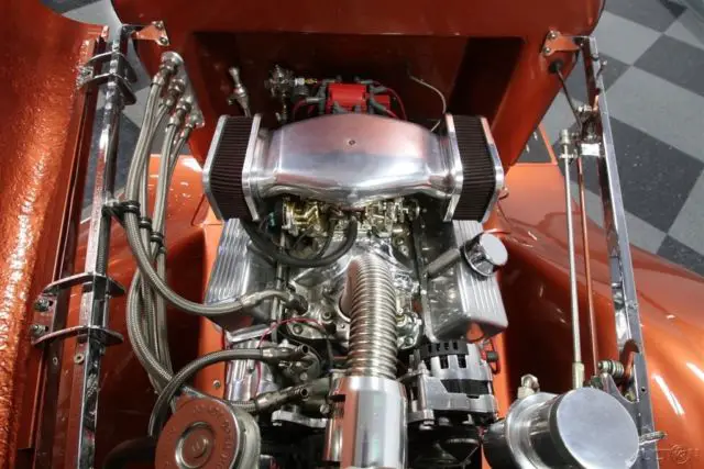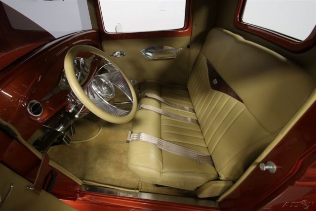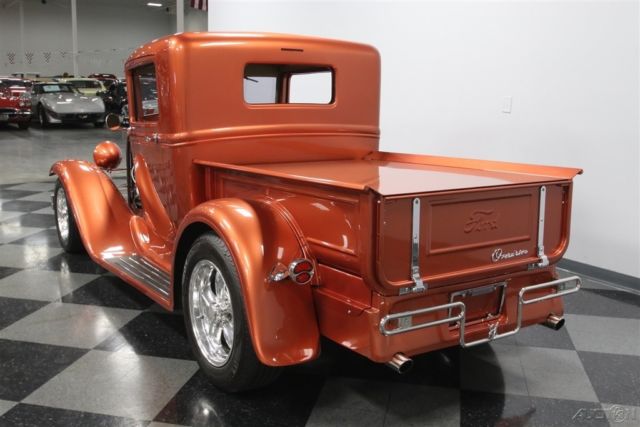 Cruise-ins were made for this 1930 Ford Pickup. It has the right custom look on the outside, a comfortable leather A/C interior, and a nice small block under the hood that makes a sweet rumble without losing friends. It's a fresh turn-key smile machine just waiting for you. This truck has a mean stance that combines the original hot rod spirit with a bit more modern touches. After all, this is the iconic shape of the Model A pickup, but it's a professional build with tighter body gaps thanks to a modern fiberglass cab. And the modern metallic orange paint radiates the sunlight so that it really highlights every one of the classic Ford curves. This same expert mix of vintage and modern is seen throughout the truck. So you have great classic details like the front bumper, headlight bar, waterfall grille, and windshield overhang. They blend nicely with upgrades like the custom rear bumper, dual exhaust tips, and polished American Racing Torq Thrust wheels with an aggressive 15/17 inch front/rear stance. You better believe people will remember this truck even time they see the tonneau cover electronically raise from its flush-fitted mounting. Inside, this 1930s-style machine has been customized to be the most comfortable cruiser you will find anywhere. It starts with a custom bench seat that has terrific bolstering and finished in supple leather. This quality presentation continues on the side panels, headliner, and even the carpet piping for a full uniform look. You get a Billet Specialties steering wheel on a polished tilt column. And beyond that is a bright dash panel with a full set of Classic Instruments gauges. You get all the right extras, including cold R134a air conditioning and an AM/FM/CD stereo with Bluetooth that's mounted in a custom headliner console. And there's power windows for not only the sides, but also the rear glass, too - so you can really let the breezes run through the cab. With the engine on display to the world, you want it to be as shiny as this one. The air topper, valve covers, alternator, compressor, tubing, pulleys, intake, and so much more are drawing attention, so you might win awards for the polished pieces alone. But look closely, and you'll also see nice performance substance behind the shine. This is a 350 cubic-inch crate motor that's been enhanced with an Edelbrock four-barrel carburetor, Edelbrock EPS intake, twin Holley air intake, and shorty headers. More than just the motor, it's worth looking at the undercarriage photos for all the upgrades under the skin. Up front is an independent suspension with tubular A-arms. In back are adjustable coilovers as well as a stout Ford 9-inch rear. We know you spotted the glasspacks on the dual exhaust - they give this truck a muscular soundtrack. But more than just powerful, this one was built to be a true cruiser. That's why you have a four-speed automatic transmission with highway-friendly overdrive. The aluminum radiator with electric fan is there to make sure this V8 runs cool even if you're in traffic with the A/C pumping. Add in power steering, four-wheel disc brakes, and the modern grip of Michelin tires, and you have a terrific total driving package. With barely 4,000 miles on this truck since it was built, you can tell this has been a cherished custom - we even have the build receipts to prove it! So if you're ready to enjoy a cut-above classic, call today!