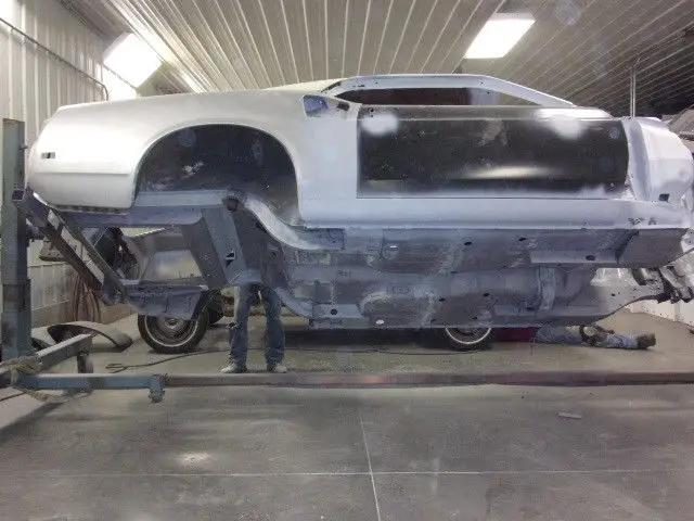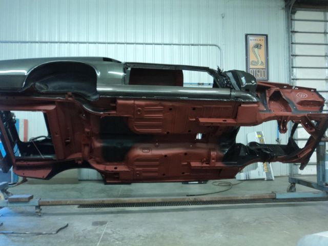 The primer white 1969 Mustang on the rotisserie is being fully restored to Factory Ford 1969 Boss 429 specs. Boss 429 shock towers/braces, staggered rear shocks, trunk mounted battery.