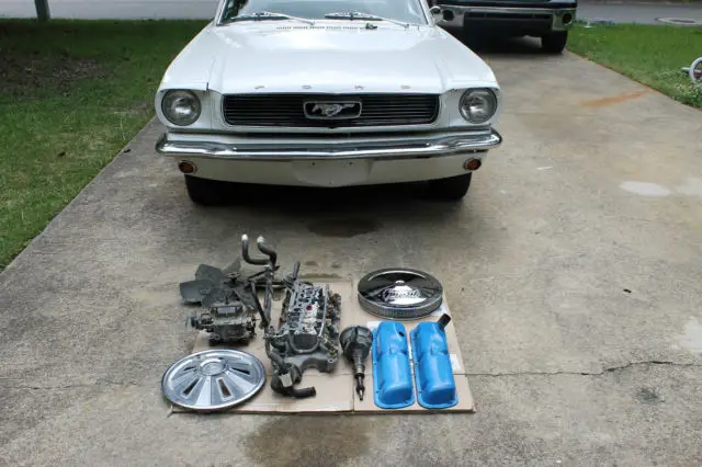 - Entire bracket and accessory system from the HO 302. Only part missing is the alternator bracket. With this addition and the use of included water pump and pulleys you have a very easy serpentine belt conversion.- Fuel rail and injectors from the HO. Primary component for a fuel injection conversion. I would have done it myself had I not just put the money into the intake and carb setup.- Spare valve covers with lower height- Spare wheel cover- Autolite 2100 carb (original to the car)- Enough hardware to reassemble the entire car. Twice. - At least a half dozen Mustang and Ford engine building books. Some useful, some outdated- Anything else I find in the garage that relates to the car