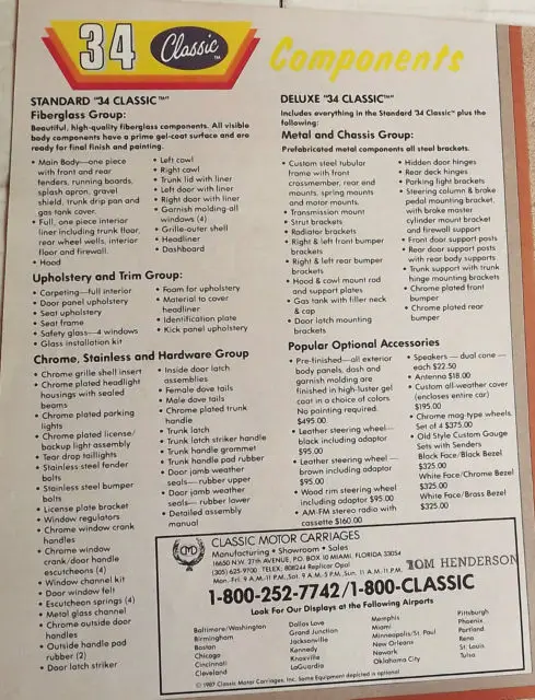 This is a complete Classic Motor Carriages 1934 Ford Coupe kit. Kit includes body and all body panel and hardware, frame and mounting brackets, wiring, interior trim, glass and more.