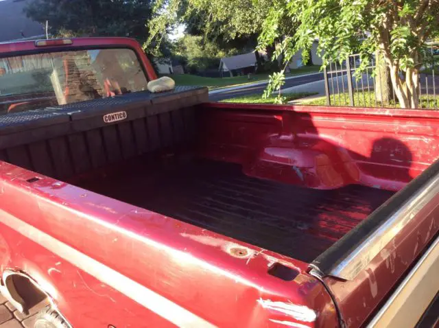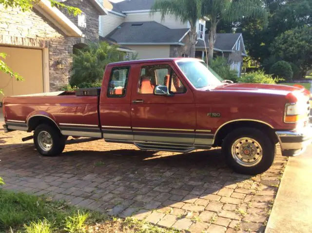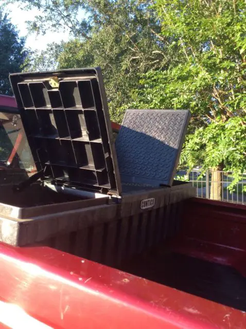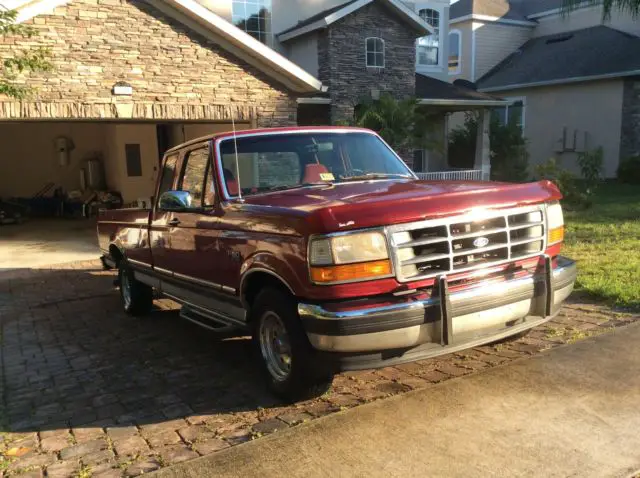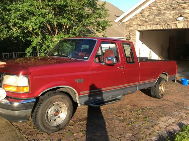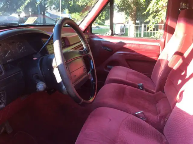 Red ford truck comes with power steering, tilt wheel, and dual gas tanks. Bed liner, towing package. Alloy wheels. Oversized off road tires. Long bed King cab. Has tool box in back. 1994. Runs good. Looks good