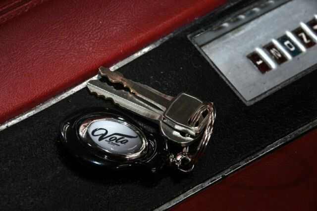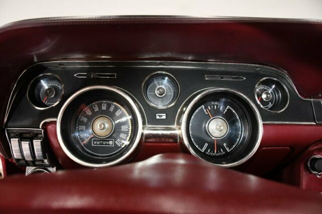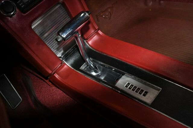 INTERIOR: The red looks really good against the white exterior. I sat in the car and right away could feel the cushions are nice and firm they must have been replaced. The red upholstery, armrests and door panels have also been replaced. The deluxe console has the "garage door" compartment. Carpets are very nice, has pony floor mats. Dash area is good, not beat up, nice vents, knobs, lenses etc.
