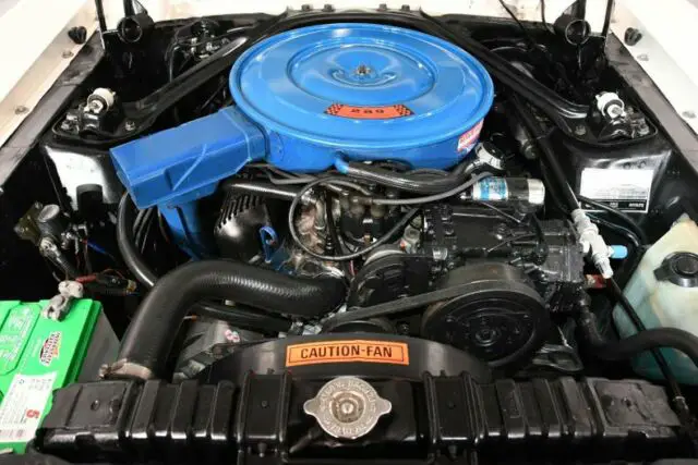 ENGINE COMPARTMENT: The 289 motor is upgraded with an aluminum intake and 4-barrel carb. It has a stock air cleaner complete with the heat riser tube going down to the exhaust. It is dressed up with some Cobra finned aluminum valve covers. It has factory air conditioning system and it's been updated with the R134a freon. It also features power steering and power brakes. Has FOMOCO radiator with the correct shroud. Everything looks proper, even has the washer bottle, wiring is neat. The metal inner fenders are clean metal, factory spotwelds are visible.