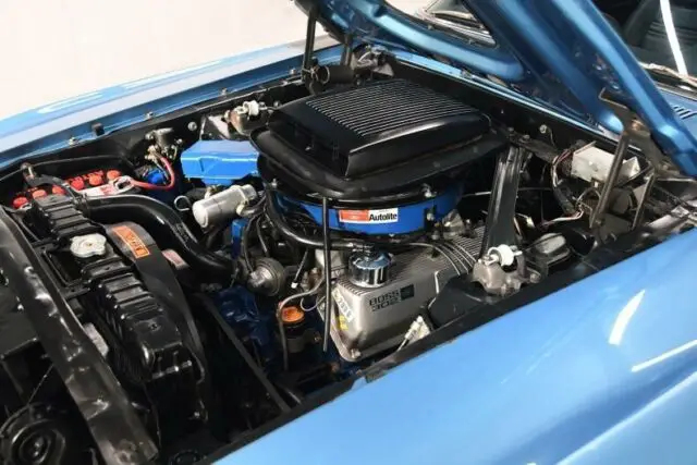 ENGINE COMPARTMENT: Vin # matched Boss 302 motor with all the correct components. Completely rebuilt. We have photos of it apart and we have cam spec card. Vin is stamped on back of block (we have picture). Has correct manifolds and aluminum finned valve covers. #s match correct carb was professionally restored. It is a Holley 780, the biggest carb Ford has used. Original #s match distributor. Original Ram Air shaker hood is complete with the snorkel and the heat riser tube it. The correct smog equipment is completely intact, even has dated belt. There's Autolite hoses, clamps, plug wires, battery topper. Has correct assembly line markings and decals. It features factory power steering and brakes too.