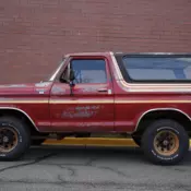 Equipped with the strong 351 V8 engine, 4 speed manual transmission, 4 wheel drive with locking hubs, original 3 speed transfer case, power steering, power brakes and factory disc brakes. New tires mounted on polished alloy Mickey Thompson wheels, swing out spare tire, increased capacity fuel tank and traction Lok-rear end